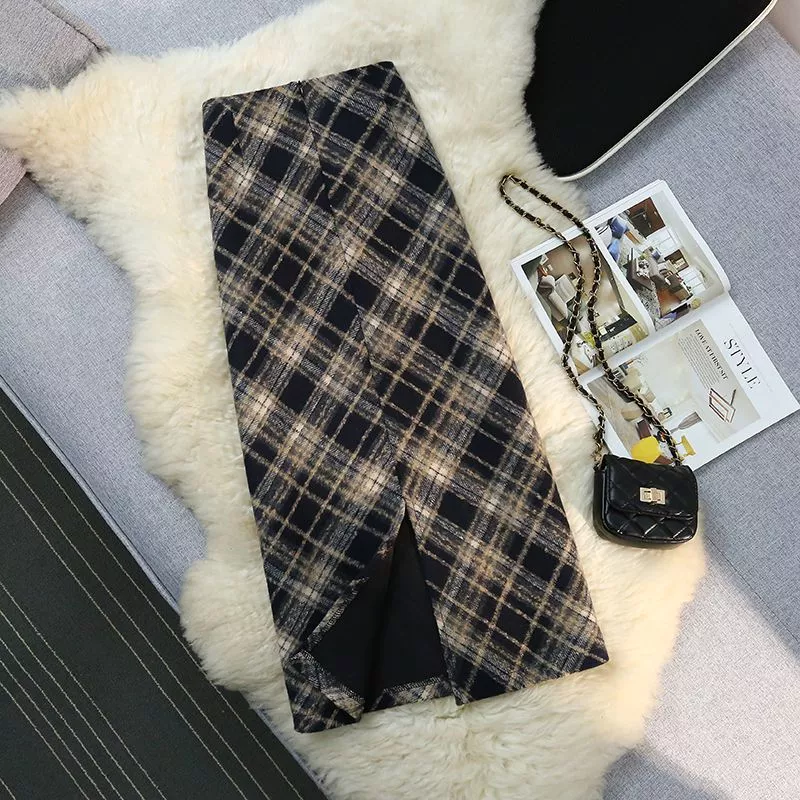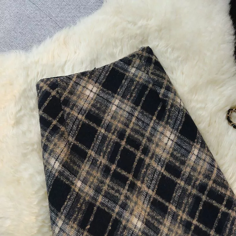 Gonna Lunga Elegante A Quadri Vita Alta In Tessuto Scozzese Nero Beige CF54267