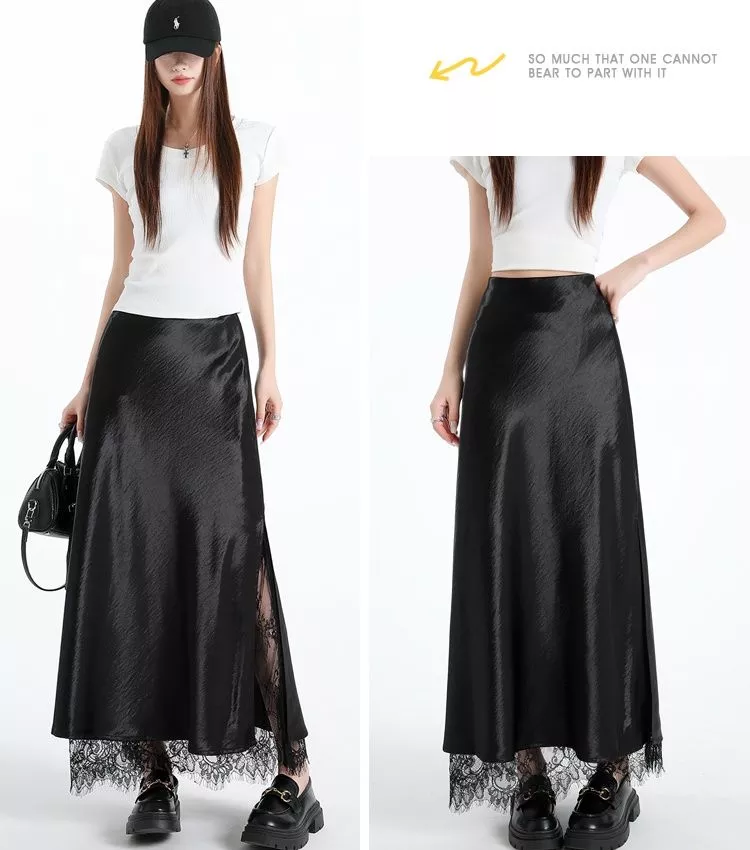 Gonna Lunga Elegante Nero Effetto Raso Con Spacco E Pizzo Sensuale CF69813