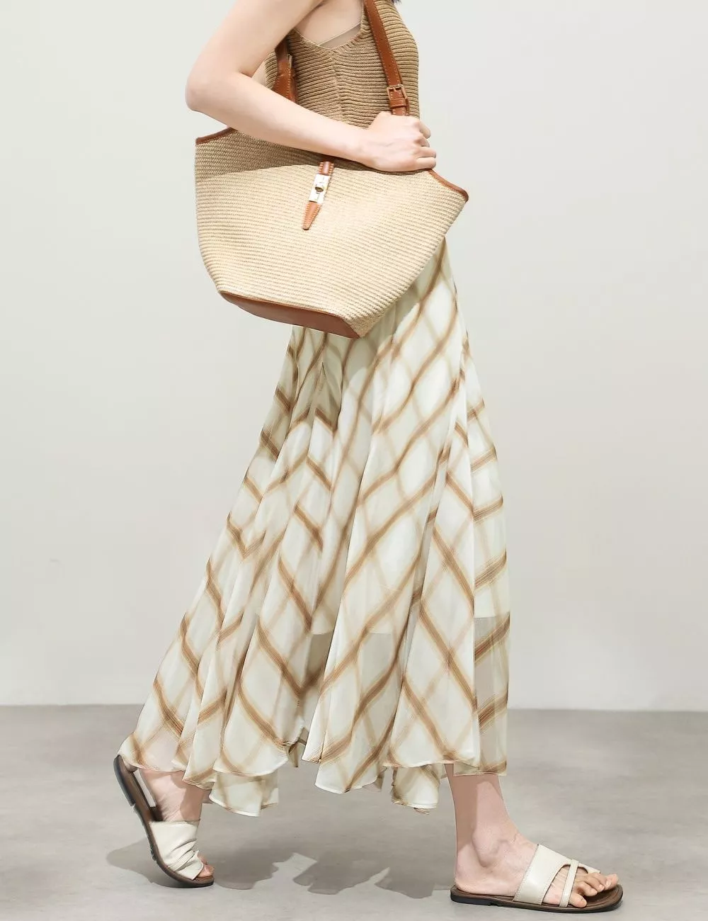 Il tessuto leggero crea una caduta morbida e dinamica, mentre la stampa geometrica diagonale nelle tonalità beige e marrone dona al capo un aspetto moderno e sofisticato.
