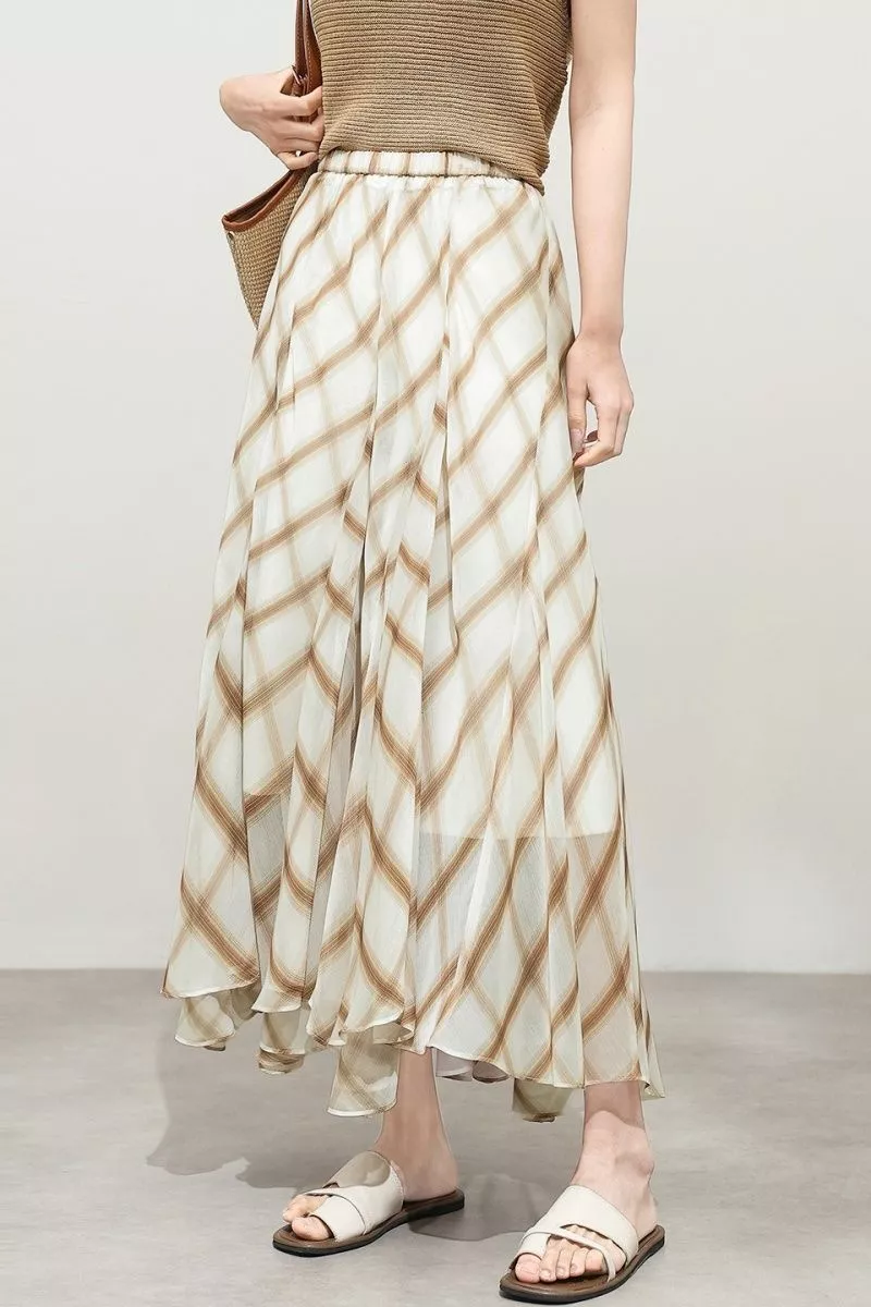 Gonna lunga dal design leggero e raffinato, caratterizzata da una silhouette fluida che accompagna i movimenti con naturale eleganza.