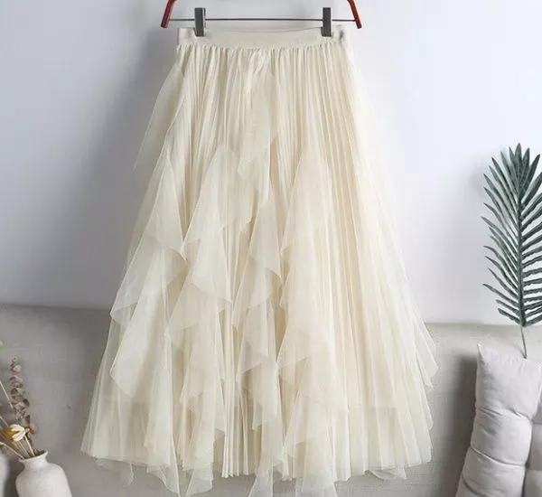 Gonna lunga in tulle con volant irregolari che creano un movimento morbido e scenografico. La vita alta elasticizzata valorizza la silhouette, mentre la lavorazione multistrato dona leggerezza e un aspetto elegante. Perfetta per outfit romantici, serate speciali, shooting fotografici o look sofisticati dal fascino moderno.