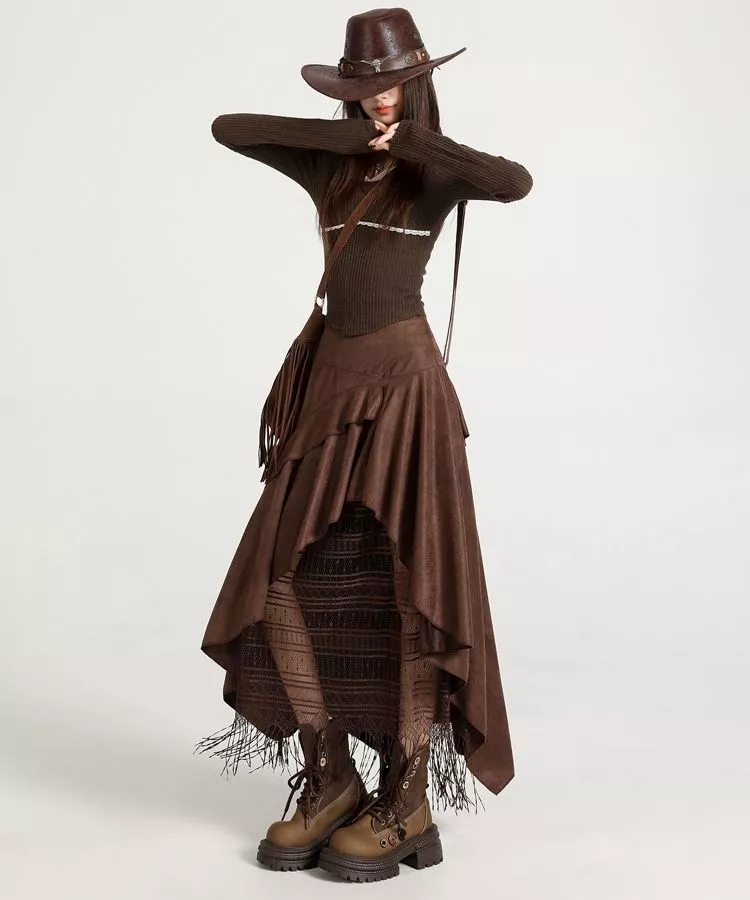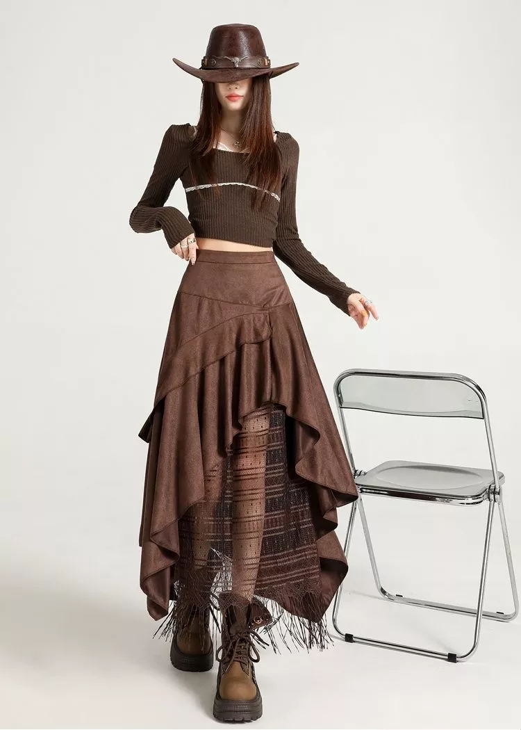 Gonna Lunga Marrone Vita Alta Con Pizzo E Frange Boho Chic Per Eventi CF53958