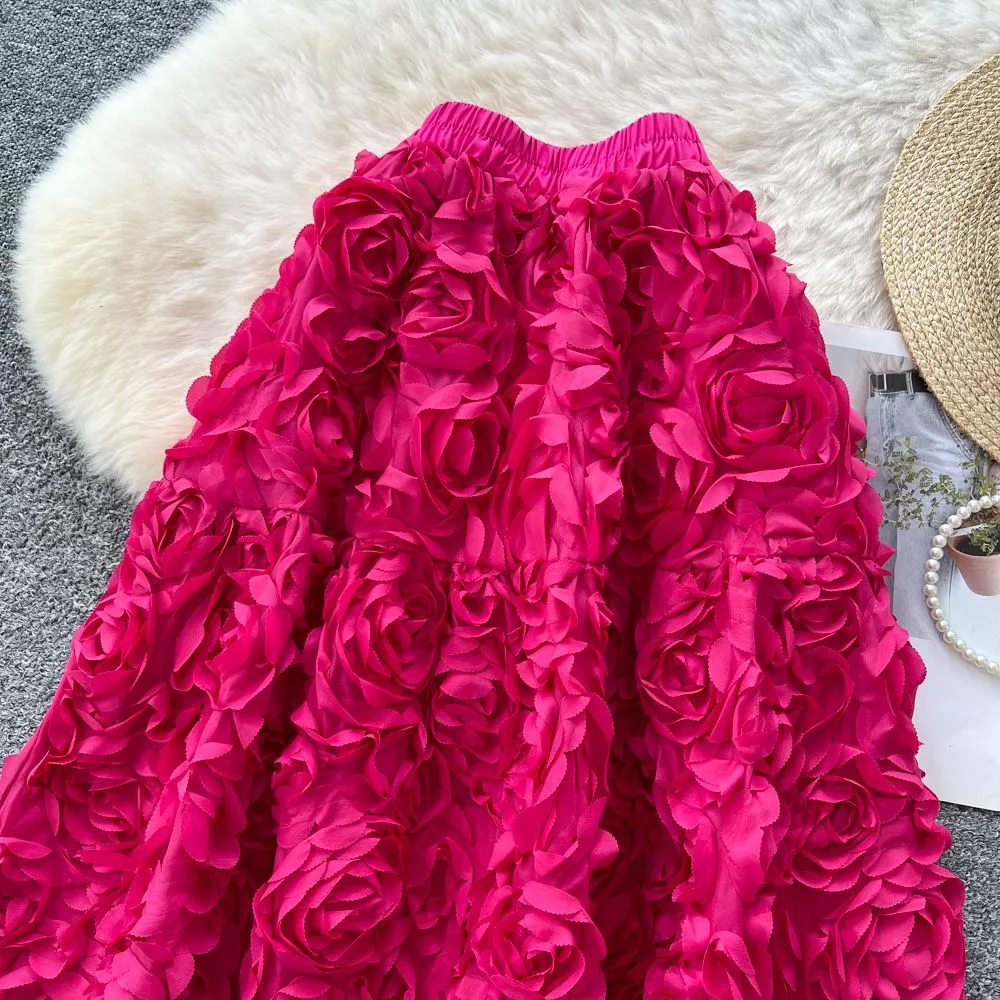 Gonna lunga a sbuffo con applicazioni floreali tridimensionali che creano un effetto rose ricco e scenografico. La vita elasticizzata garantisce una vestibilità confortevole, mentre il volume morbido valorizza il movimento e dona un aspetto elegante e femminile. Perfetta per outfit romantici, eventi, cerimonie e look raffinati in cui si desidera un capo d'impatto. La texture floreale rende questa gonna un pezzo speciale, ideale per chi ama uno stile ricercato e distintivo.