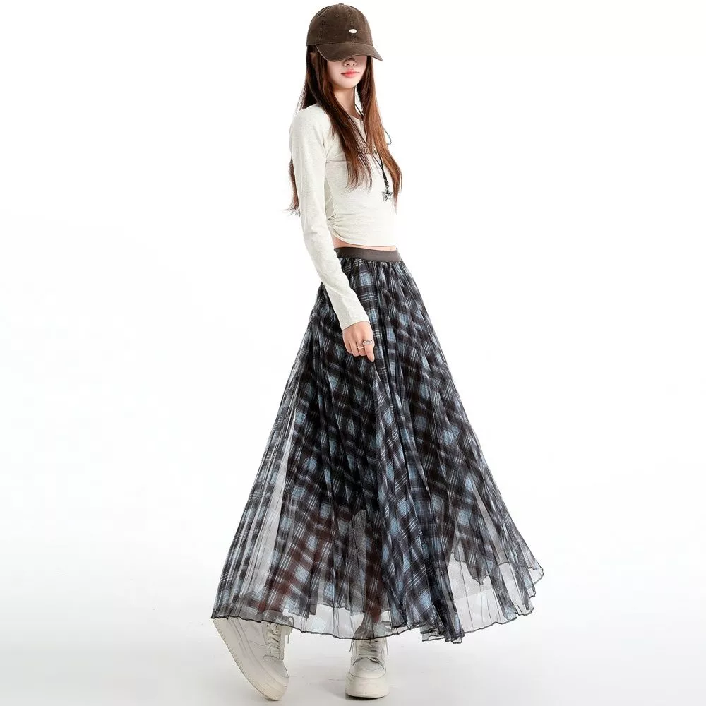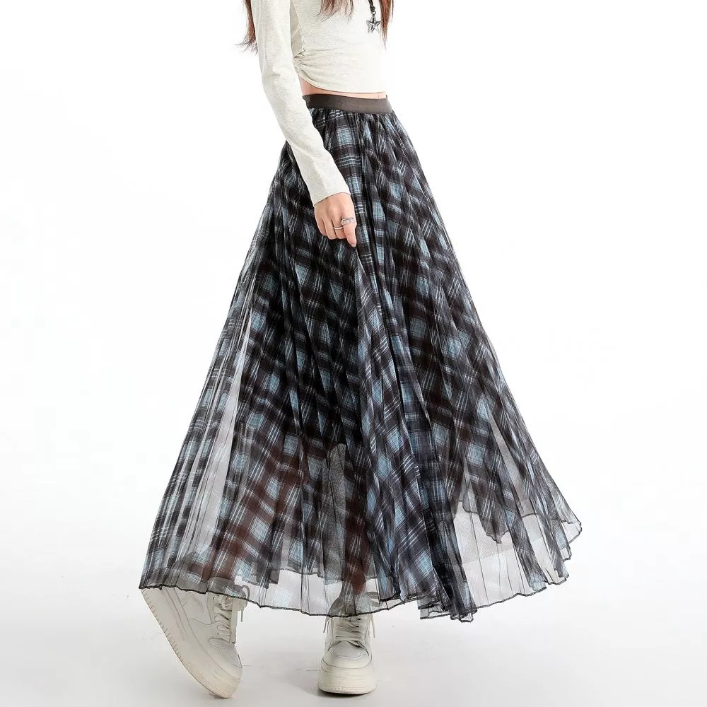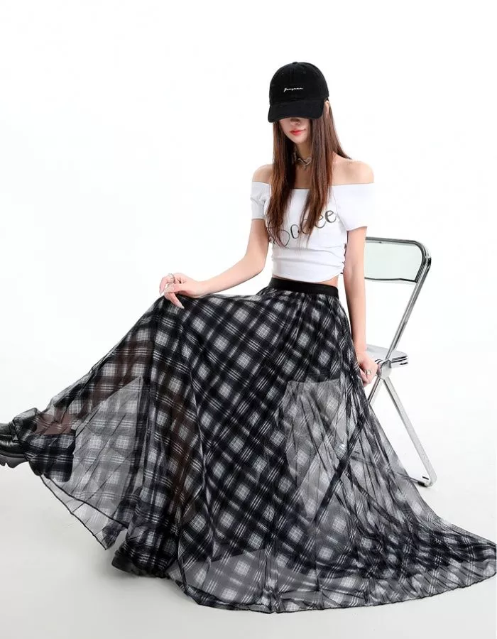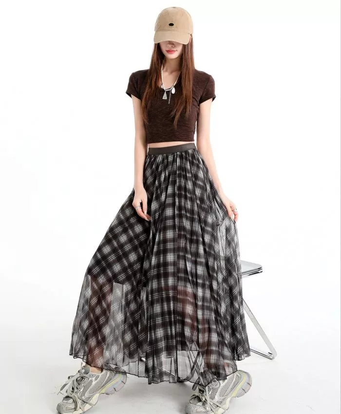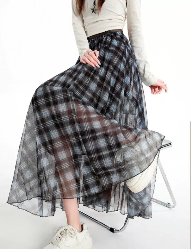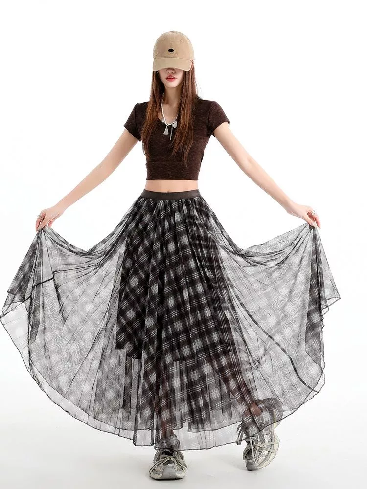 Gonna lunga a quadri dal carattere moderno e versatile, perfetta per outfit casual e street style. Il design a vita alta valorizza la silhouette mentre il tessuto leggero con effetto tulle dona movimento e volume. Ideale da abbinare a sneakers o anfibi per look contemporanei e di tendenza.