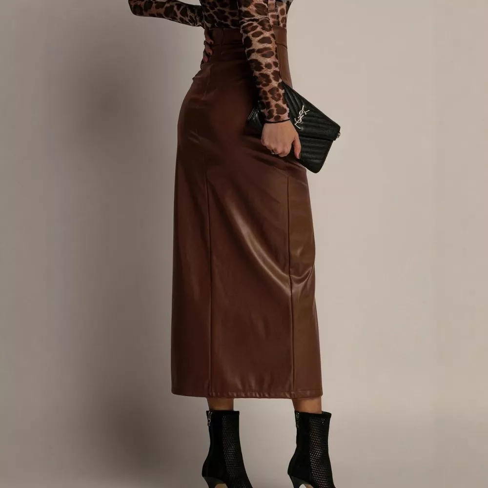 Gonna longuette effetto pelle dal design femminile e sofisticato, perfetta per look eleganti e outfit serali. Il taglio aderente valorizza la silhouette mentre lo spacco frontale dona movimento e sensualità al capo. Un modello versatile ideale per creare abbinamenti raffinati per ufficio, eventi e serate.