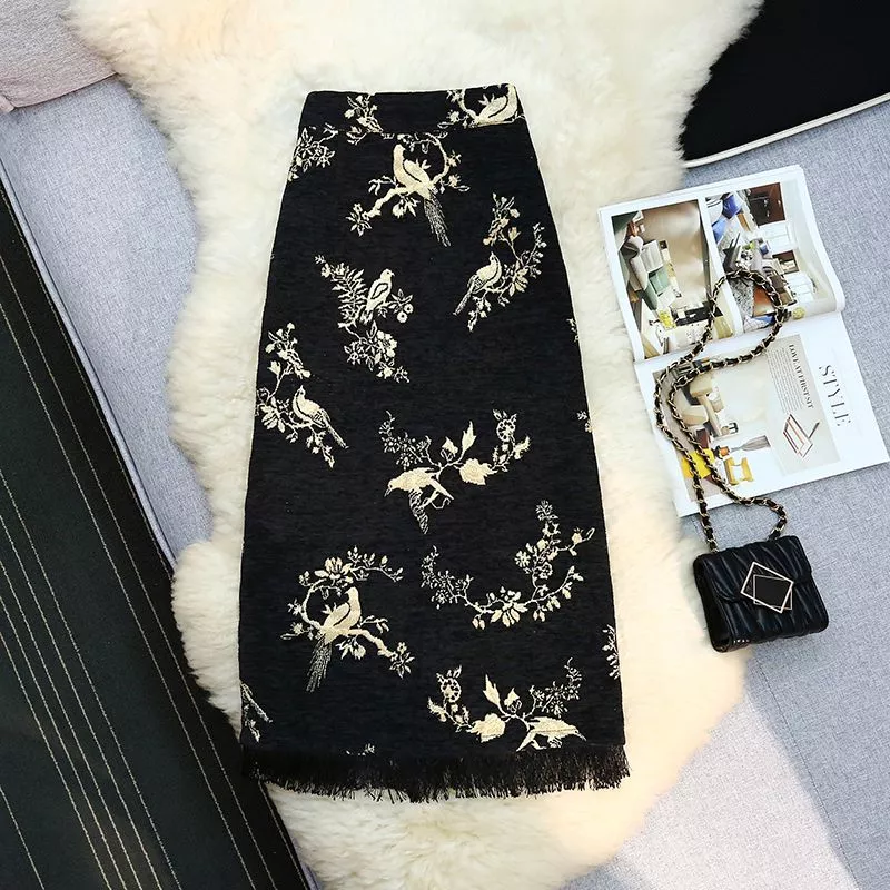 Gonna Lunga Elegante Nera Jacquard Vita Alta Con Ricami Oro E Frange CF54262