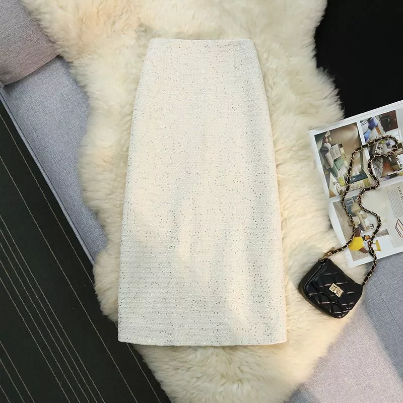 Gonna Lunga Elegante Bianca Jacquard Vita Alta Con Paillettes Chic CF54266
