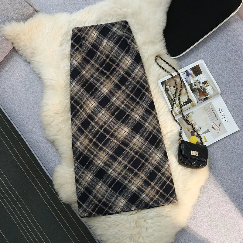 Gonna Lunga Elegante A Quadri Vita Alta In Tessuto Scozzese Nero Beige CF54267