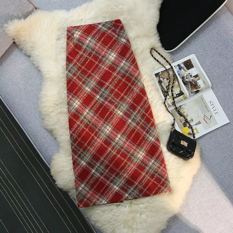 Gonna Lunga Elegante A Quadri Slim In Tessuto Scozzese Rosso Grigio CF54267
