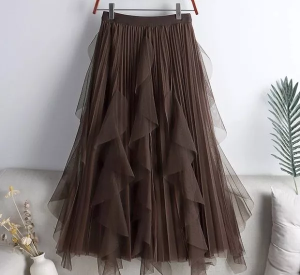 Gonna Lunga Marrone Tulle Volant Irregolari Elegante Vita Alta Morbida CF58946