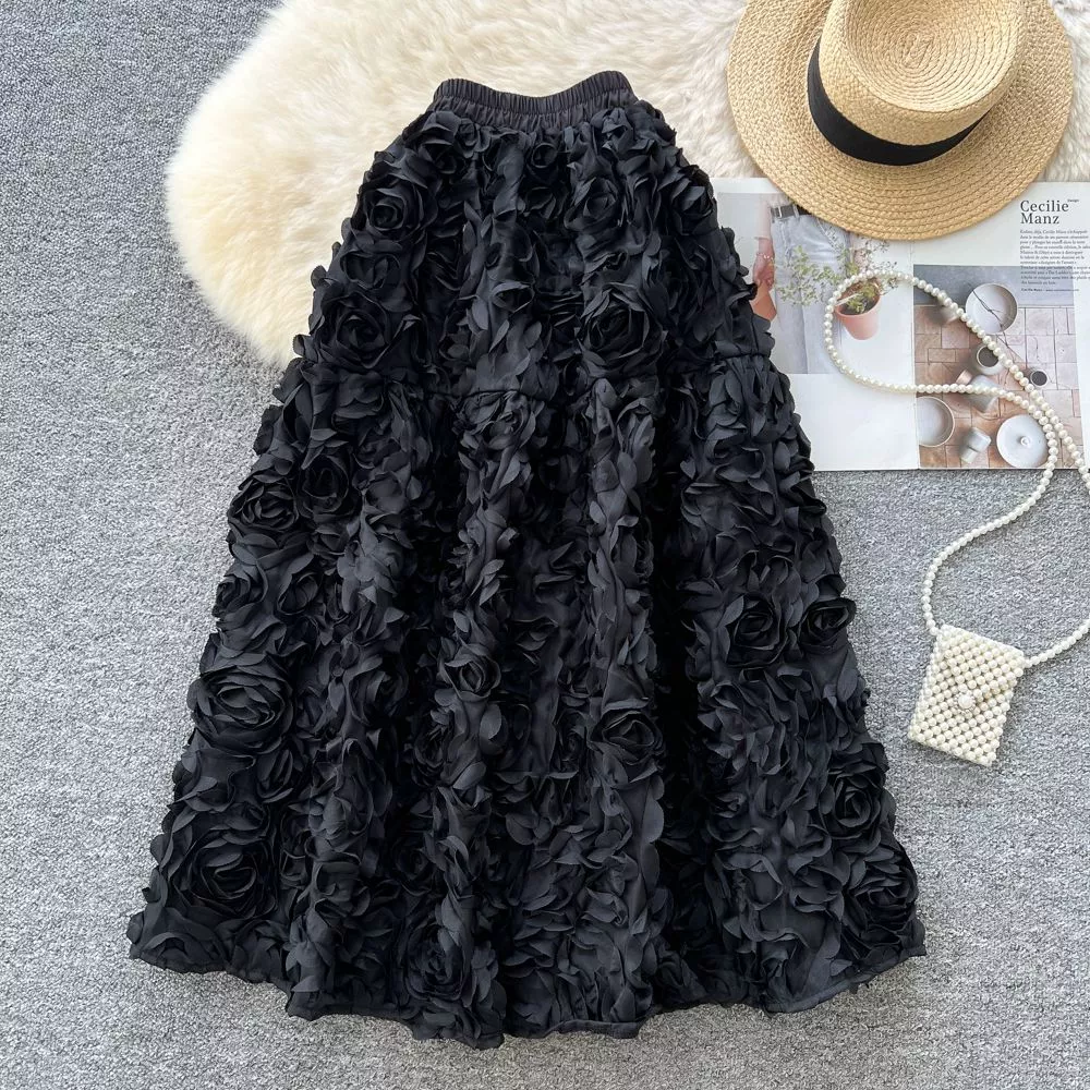 Gonna Lunga Nera Floreale Sbuffo Elegante Effetto Rose Volume Cerimonia CF59149
