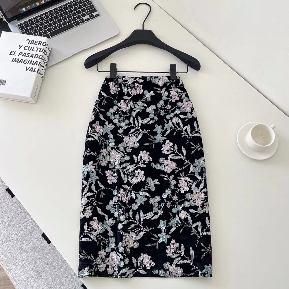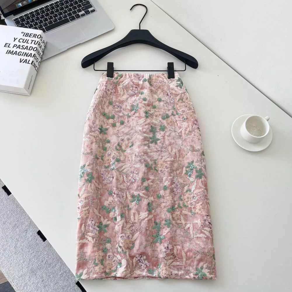 Gonna Lunga Rosa Elegante A Tubino Con Ricami Floreali In Paillettes CF64983