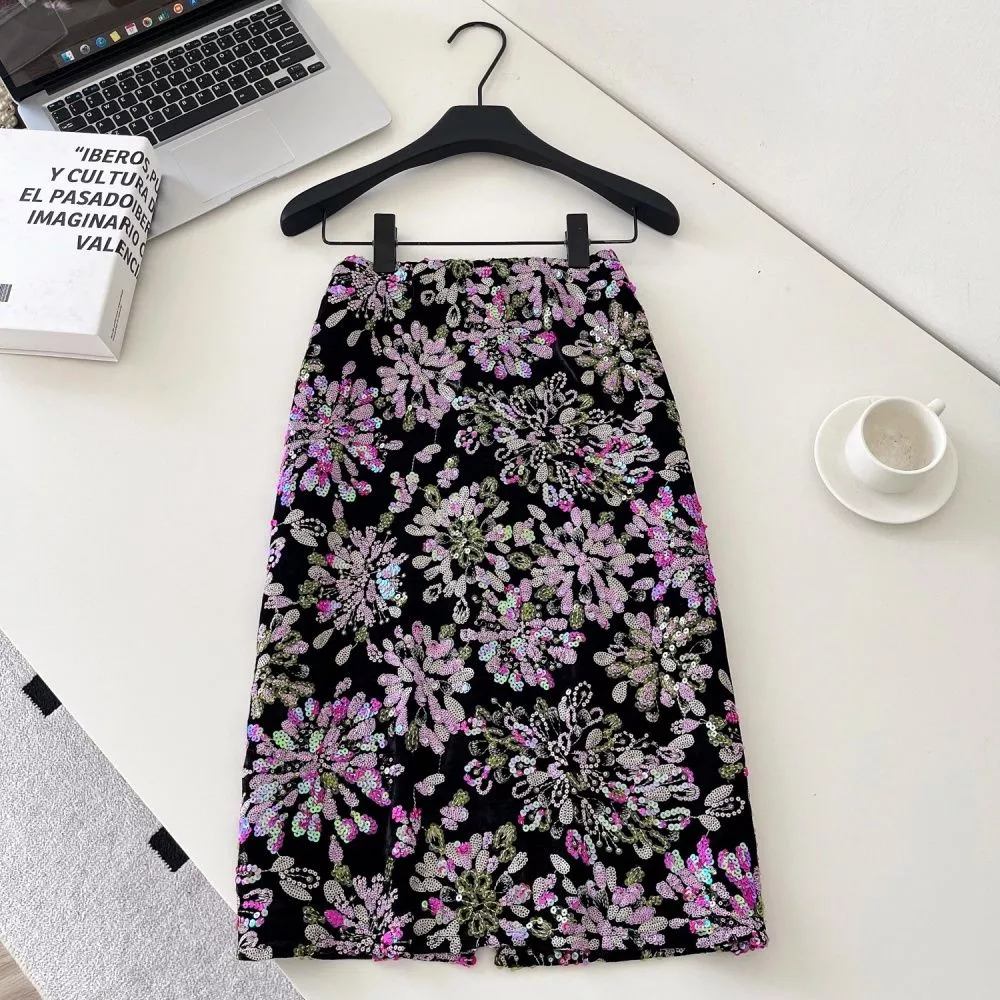Gonna Lunga Rosa Viola Elegante Tubino Con Ricami Floreali In Paillettes CF64983