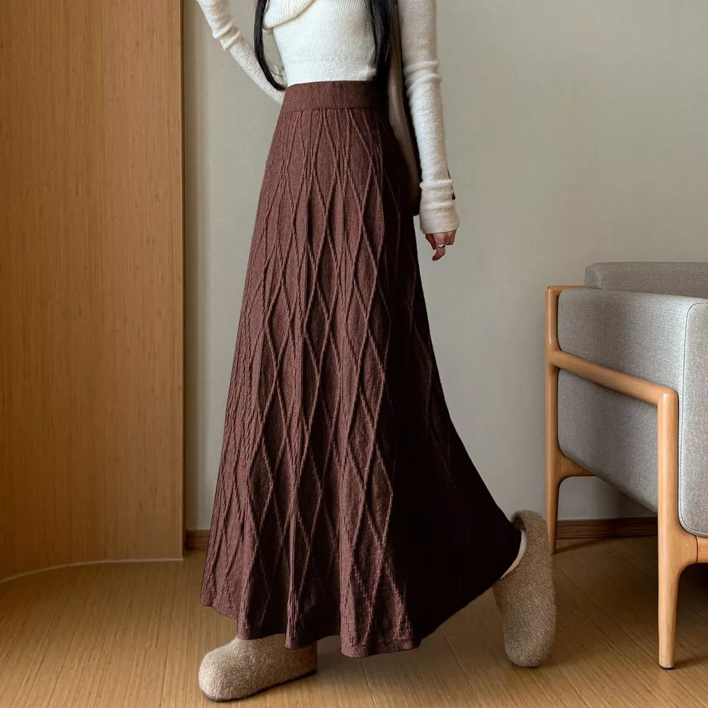 Gonna Lunga Marrone A Linea A Con Lavorazione Testurizzata Vita Elastica CF65885