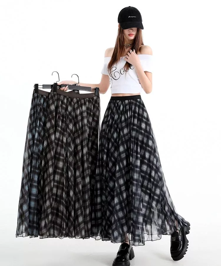 Gonna Lunga Vita Alta Tulle Quadri Ner Blu Marrone a Ampia Moda Donna CF66686