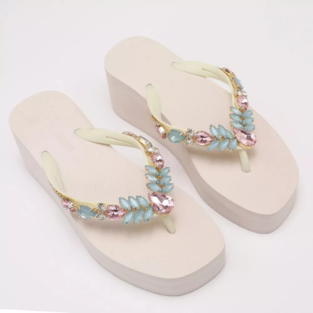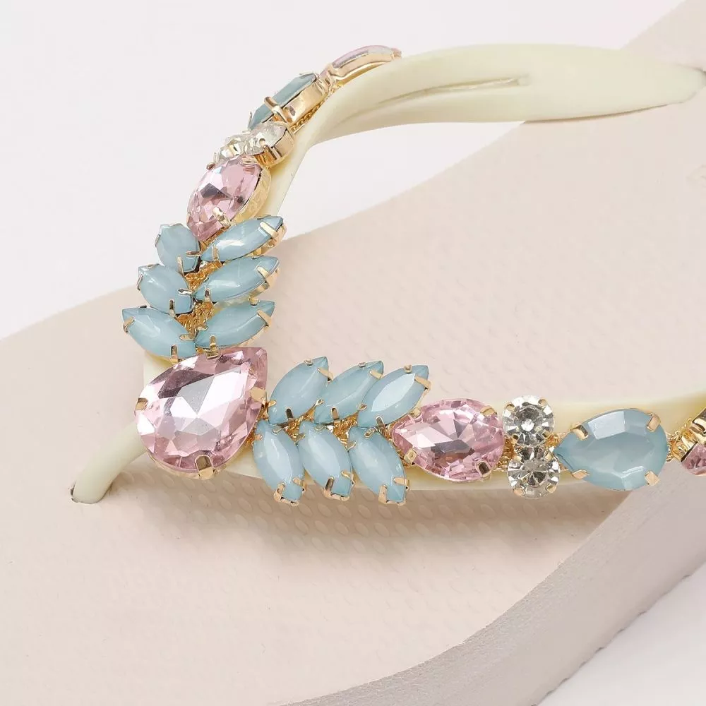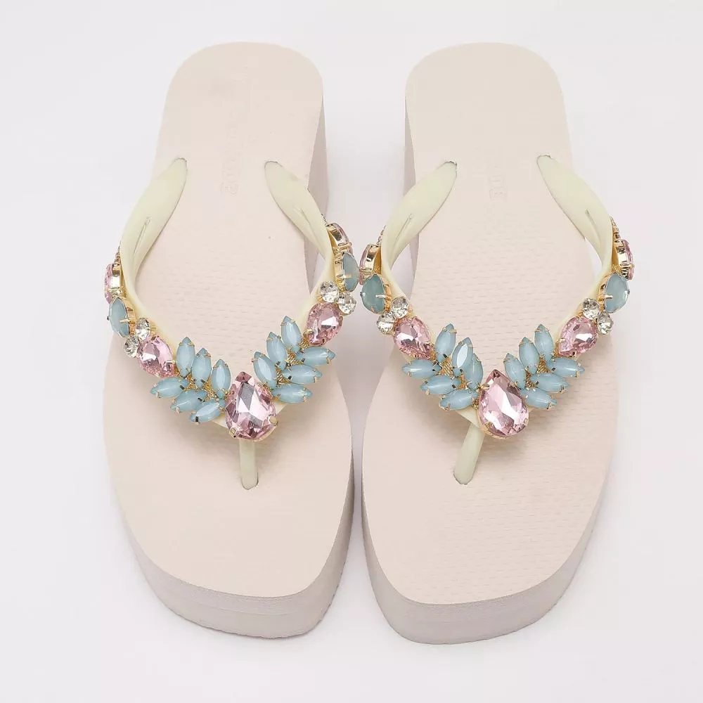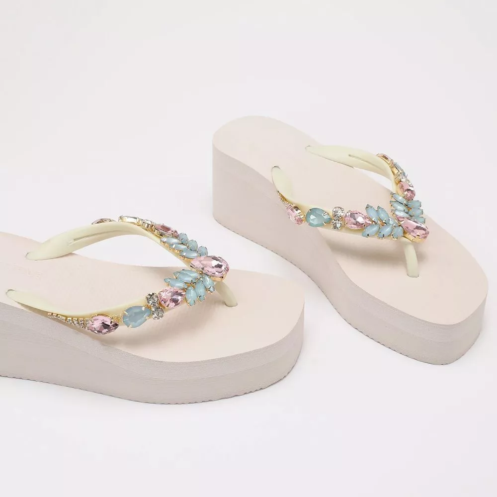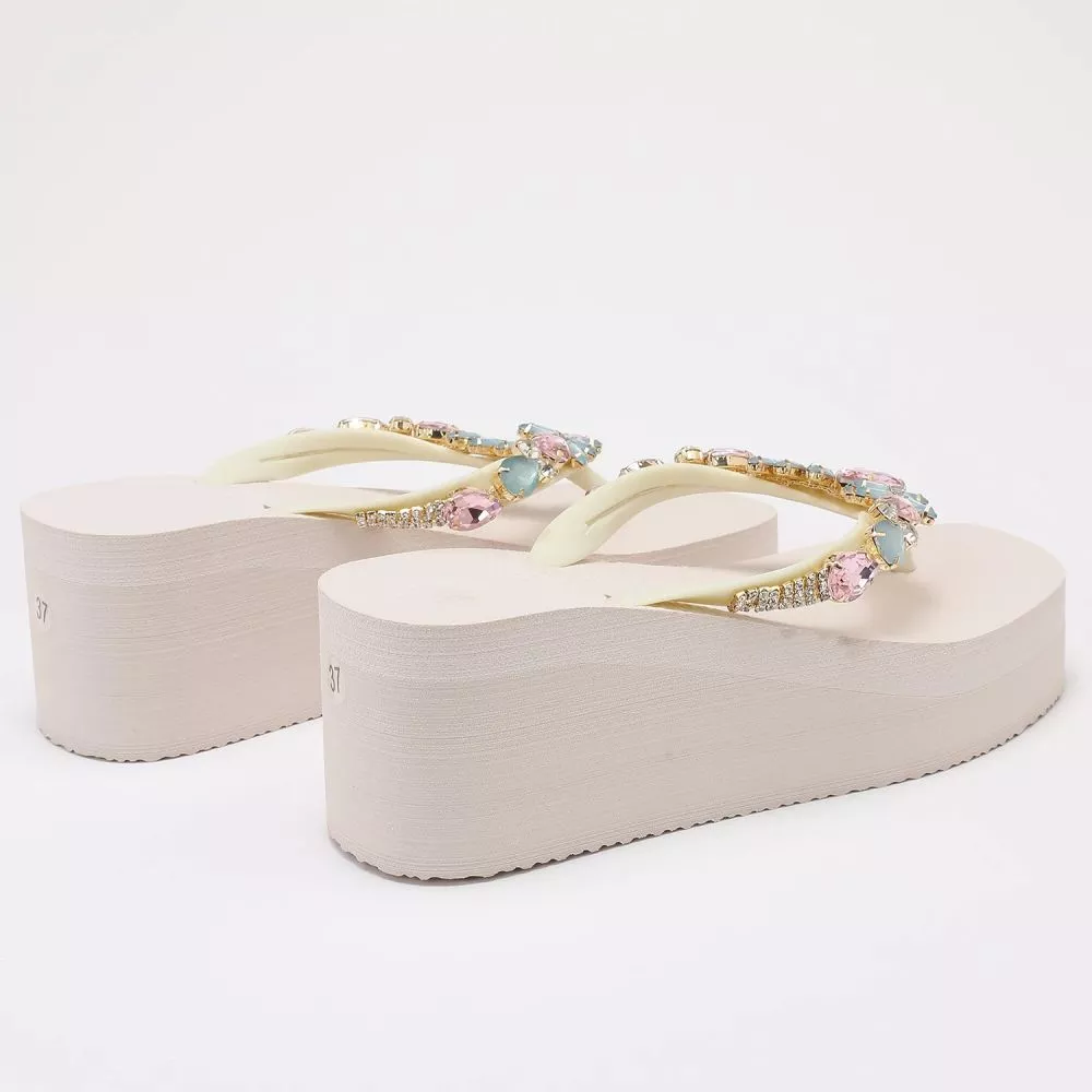 Infradito donna platform caratterizzata da una struttura essenziale valorizzata da una decorazione gioiello composta da pietre multiforma e inserti brillanti. Il design combina una base neutra beige con dettagli luminosi nei toni pastello, creando un contrasto visivo equilibrato tra semplicità e ornamento.