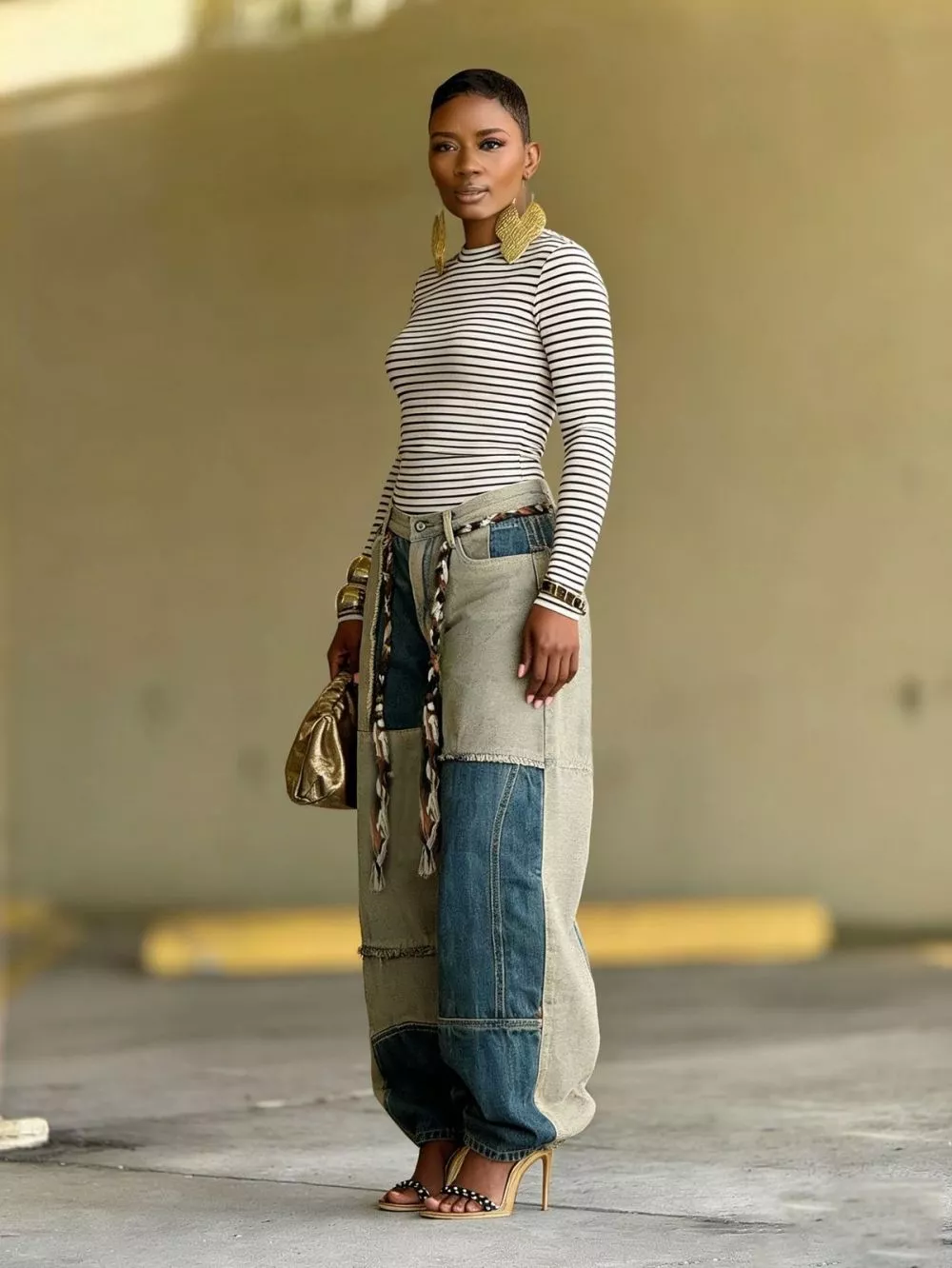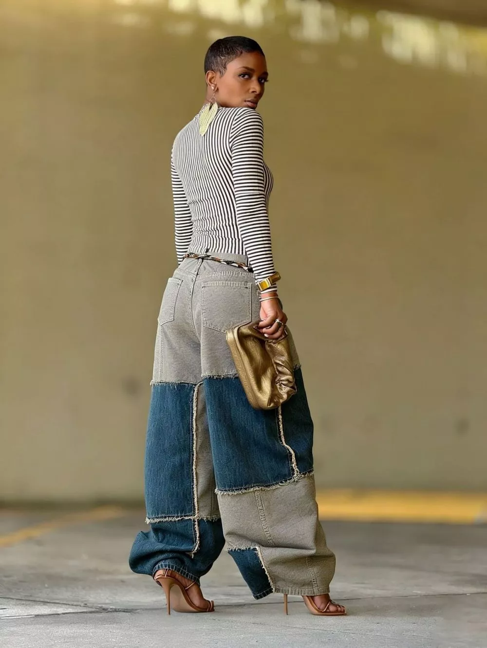 Jeans Denim Bicolore Patchwork Gamba Larga Vita Alta Streetwear T1026031928