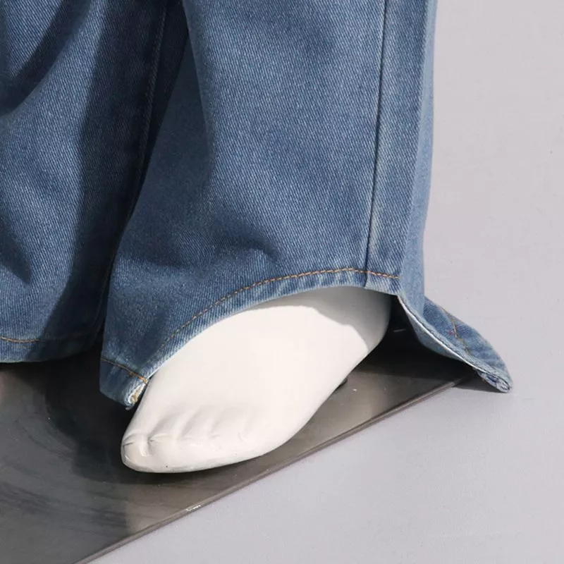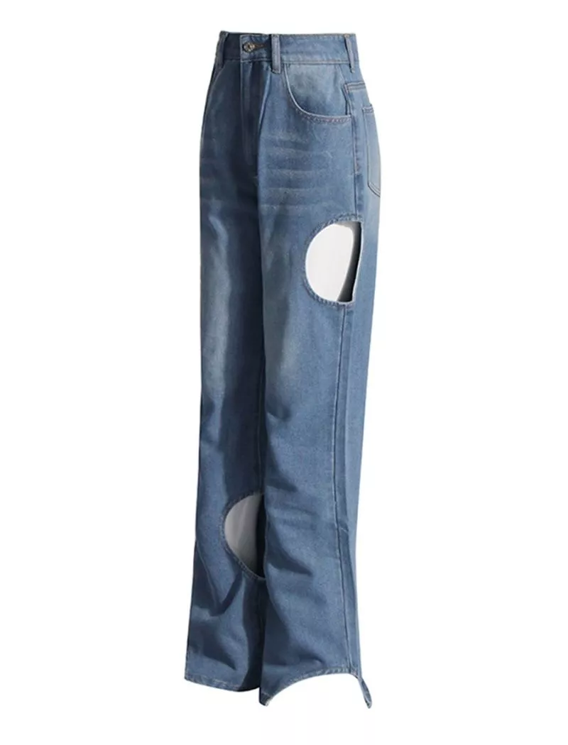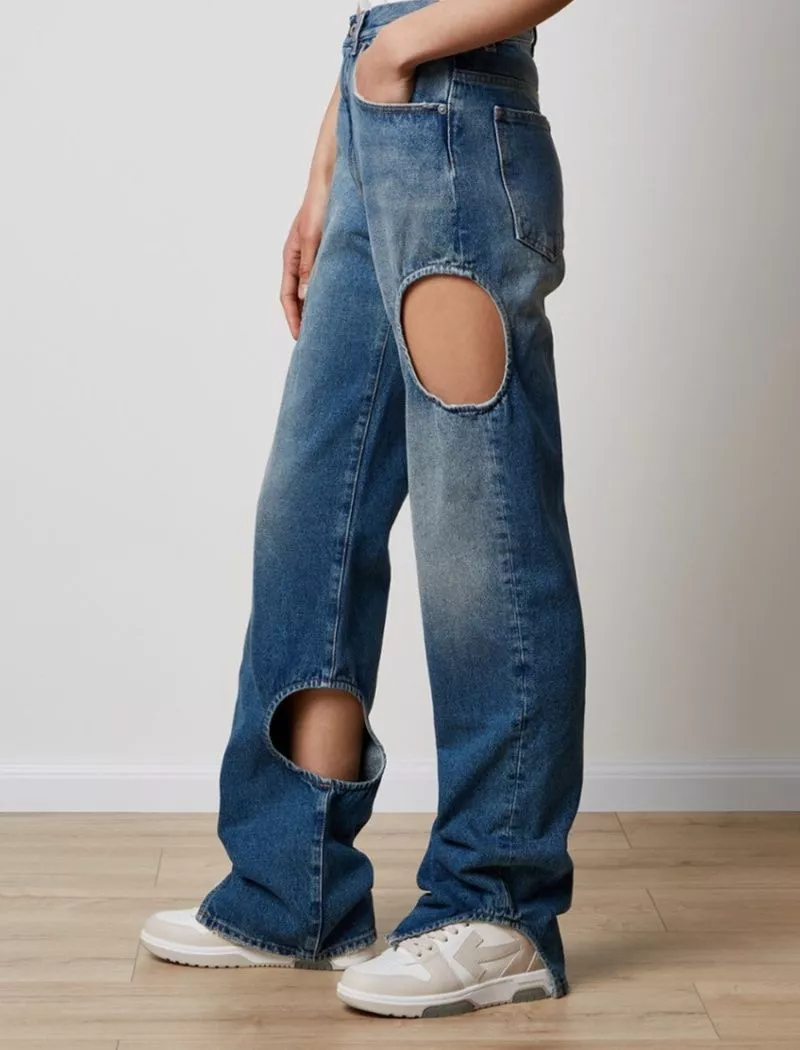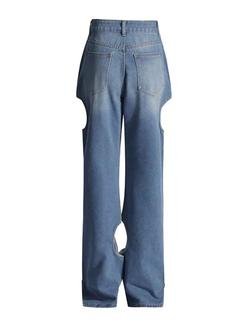 Jeans dritti in denim blu effetto vintage, caratterizzati da tagli laterali a livello di coscia e ginocchio che donano un tocco moderno e sensuale. Il design a vita alta valorizza la silhouette, mentre la gamba ampia e leggermente svasata assicura comfort e libertà di movimento.