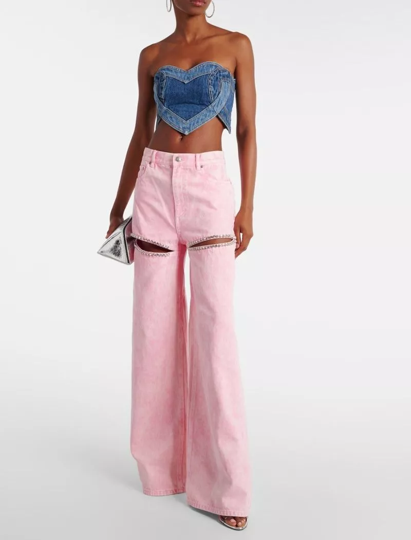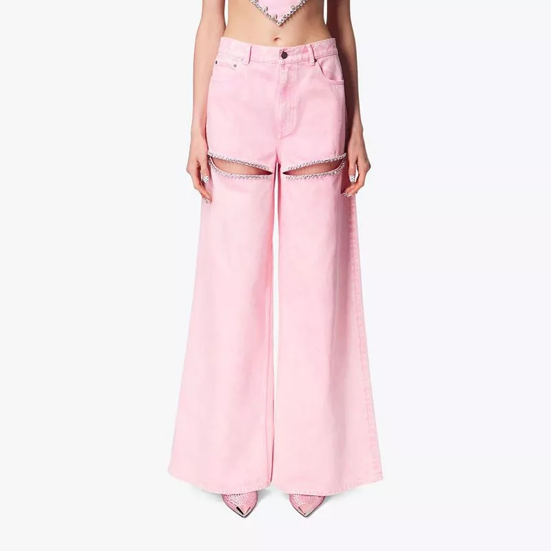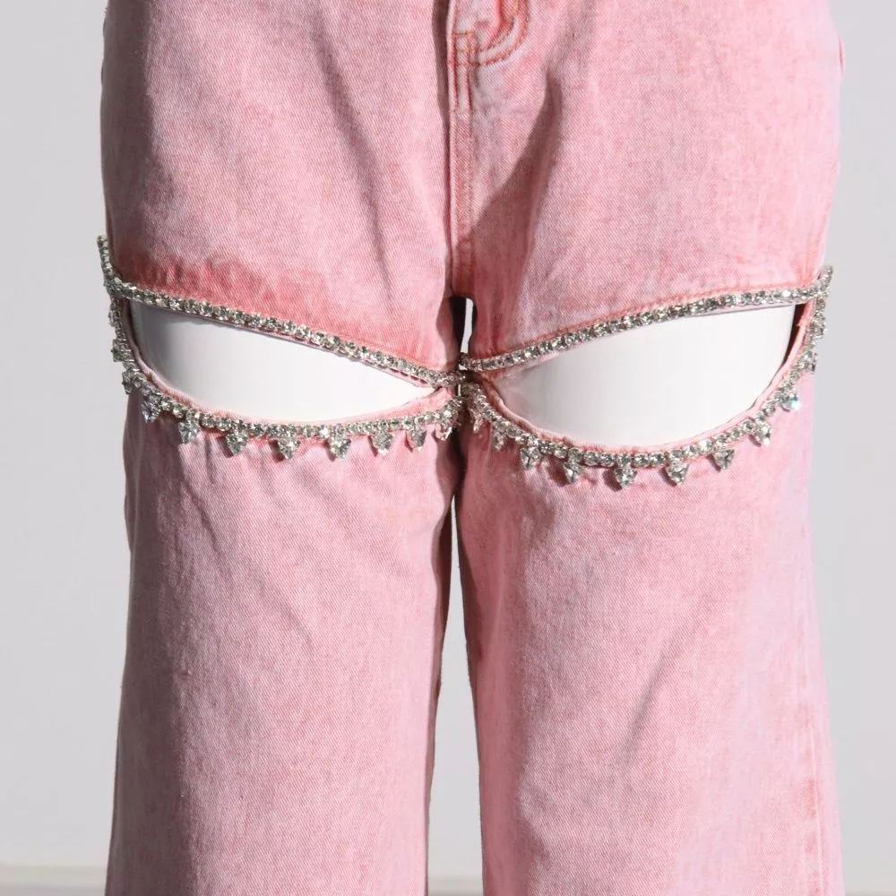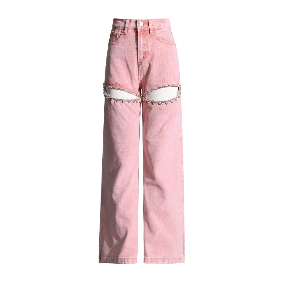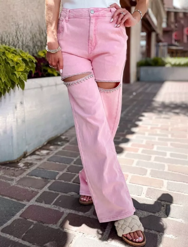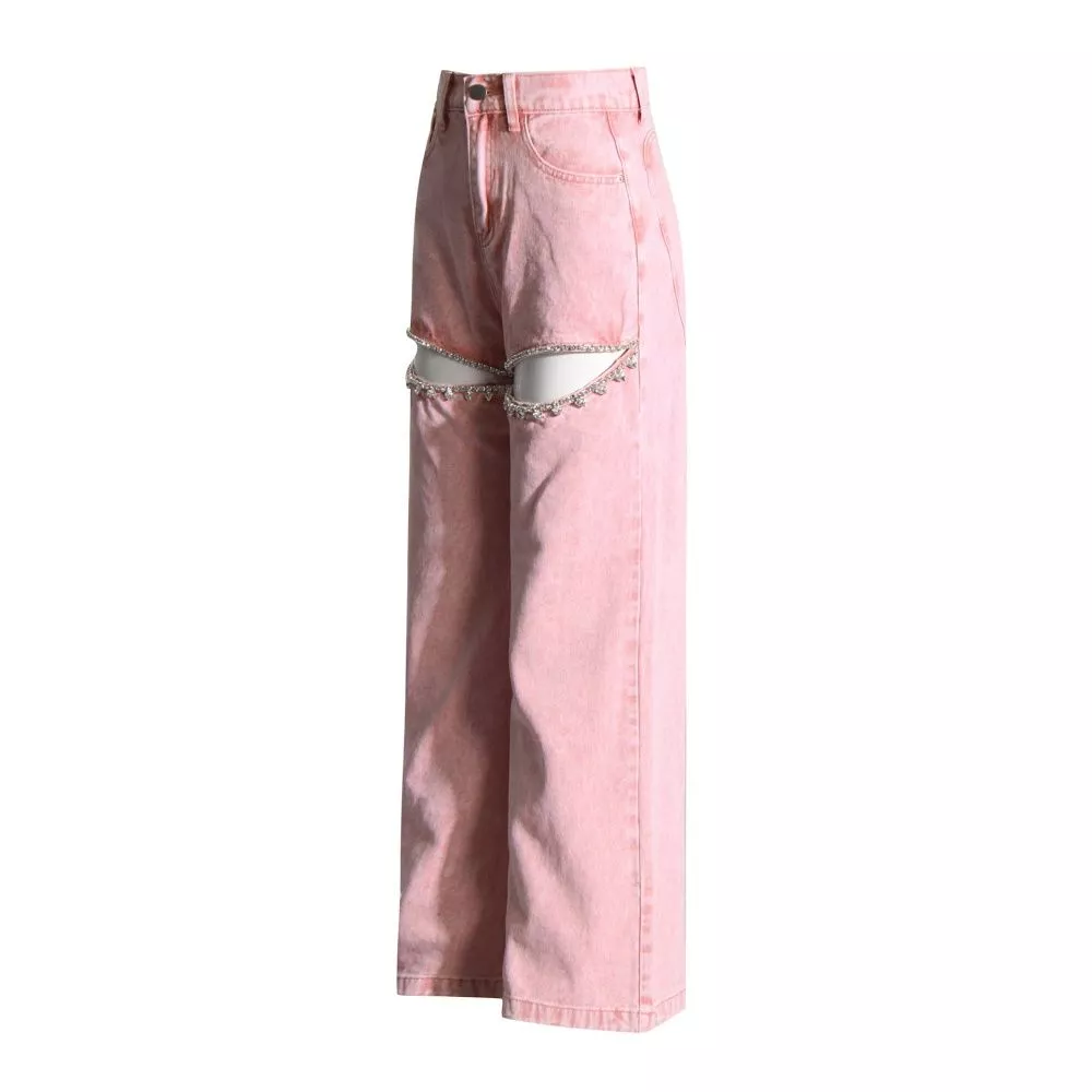 Jeans Rosa Vita Alta Gamba Larga Con Tagli Gioiello Strass Stile Fashion CF56765