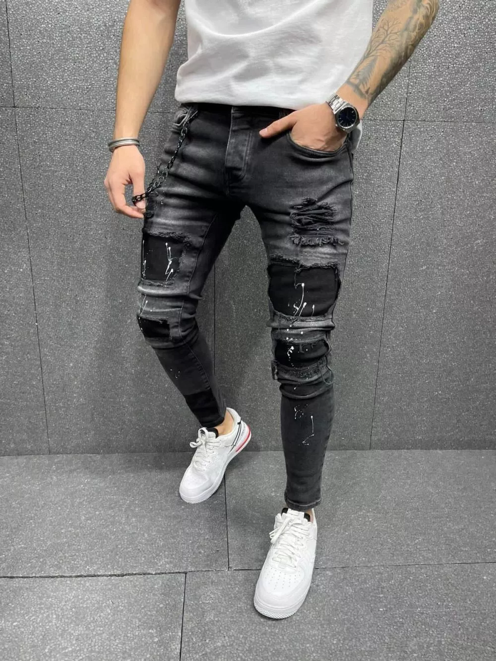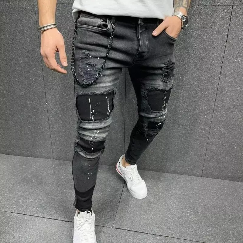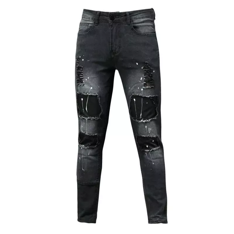 Jeans da uomo modello skinny fit realizzati in denim elasticizzato, caratterizzati da un design moderno con strappi e finitura effetto vintage. La vestibilità aderente segue la linea della gamba valorizzando la silhouette, mentre il tessuto flessibile garantisce comfort e libertà di movimento.