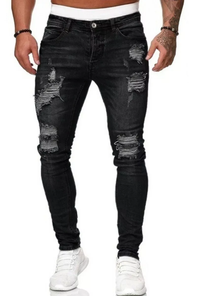 Jeans da uomo dal taglio slim fit aderente, caratterizzati da lavorazioni effetto usurato e strappi ben definiti che richiamano lo stile urbano più attuale. Il lavaggio sfumato, disponibile nelle varianti blu chiaro, blu scuro e nero, dona profondità al tessuto e crea un effetto visivo moderno e deciso.