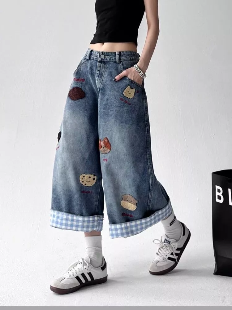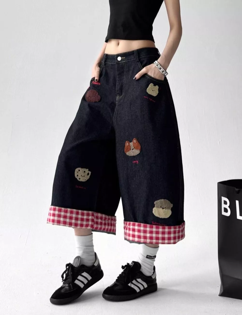 Jeans Cropped Larghi Con Ricami Divertenti Risvolto Quadretti Nero CF50335