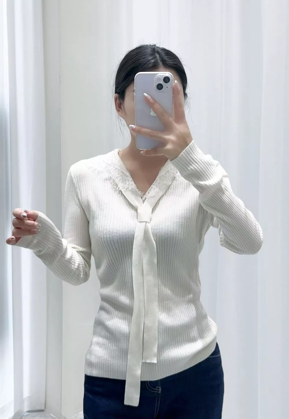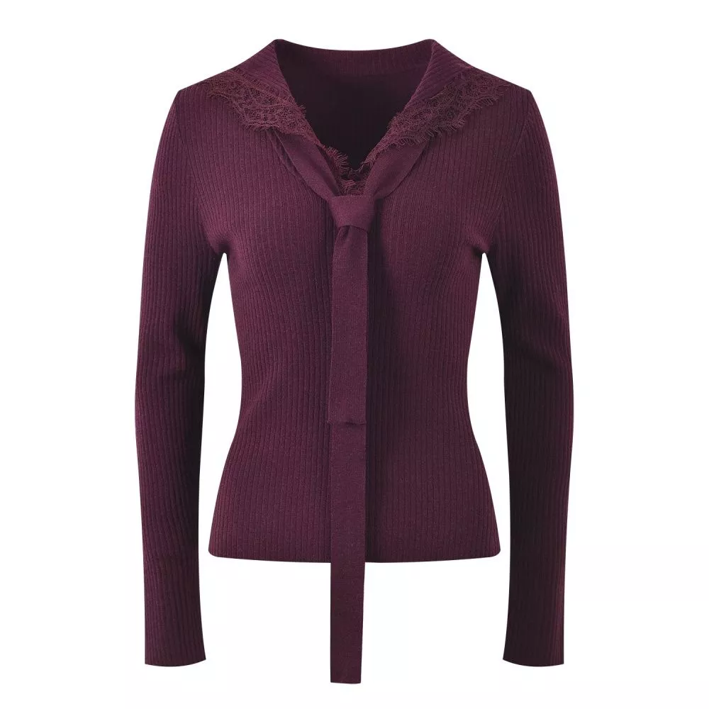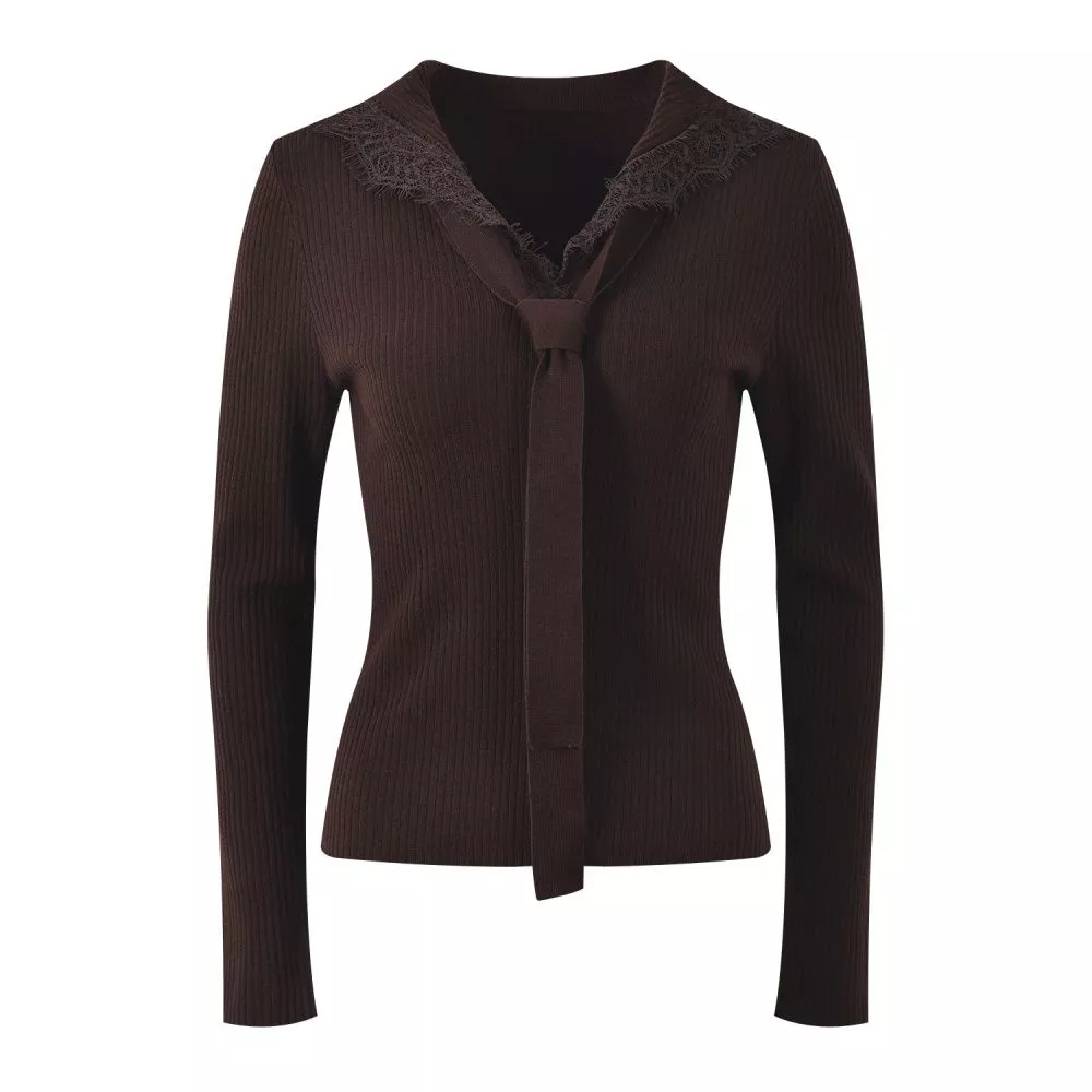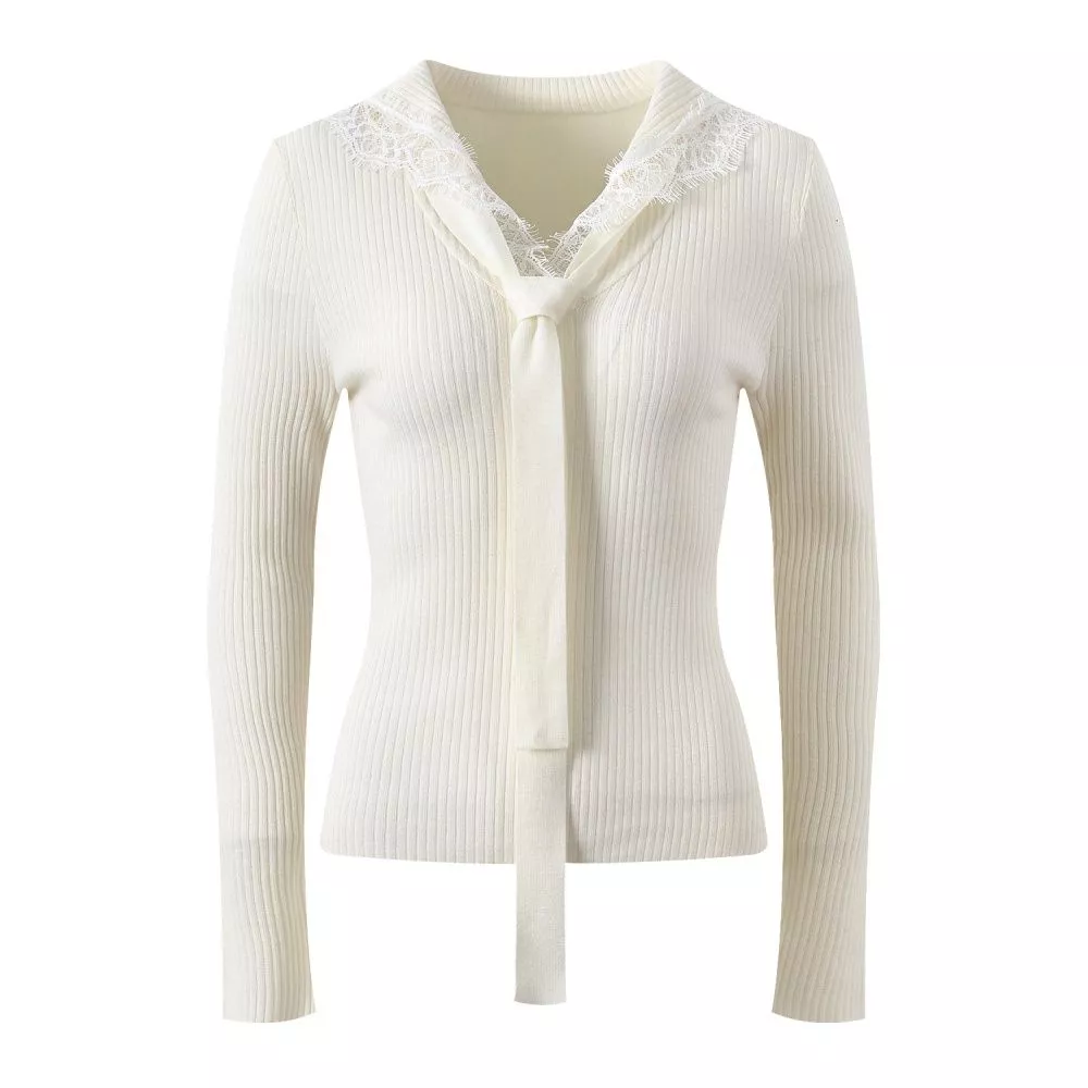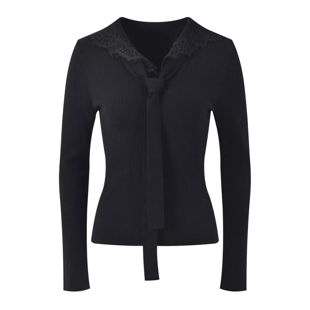 ùùùùMaglia da donna a costine sottili con vestibilità aderente, pensata per valorizzare la silhouette in modo naturale. Il design è caratterizzato da uno scollo a V rifinito con inserto decorativo in pizzo e da un cravattino centrale in tessuto coordinato che aggiunge un dettaglio femminile e raffinato.
