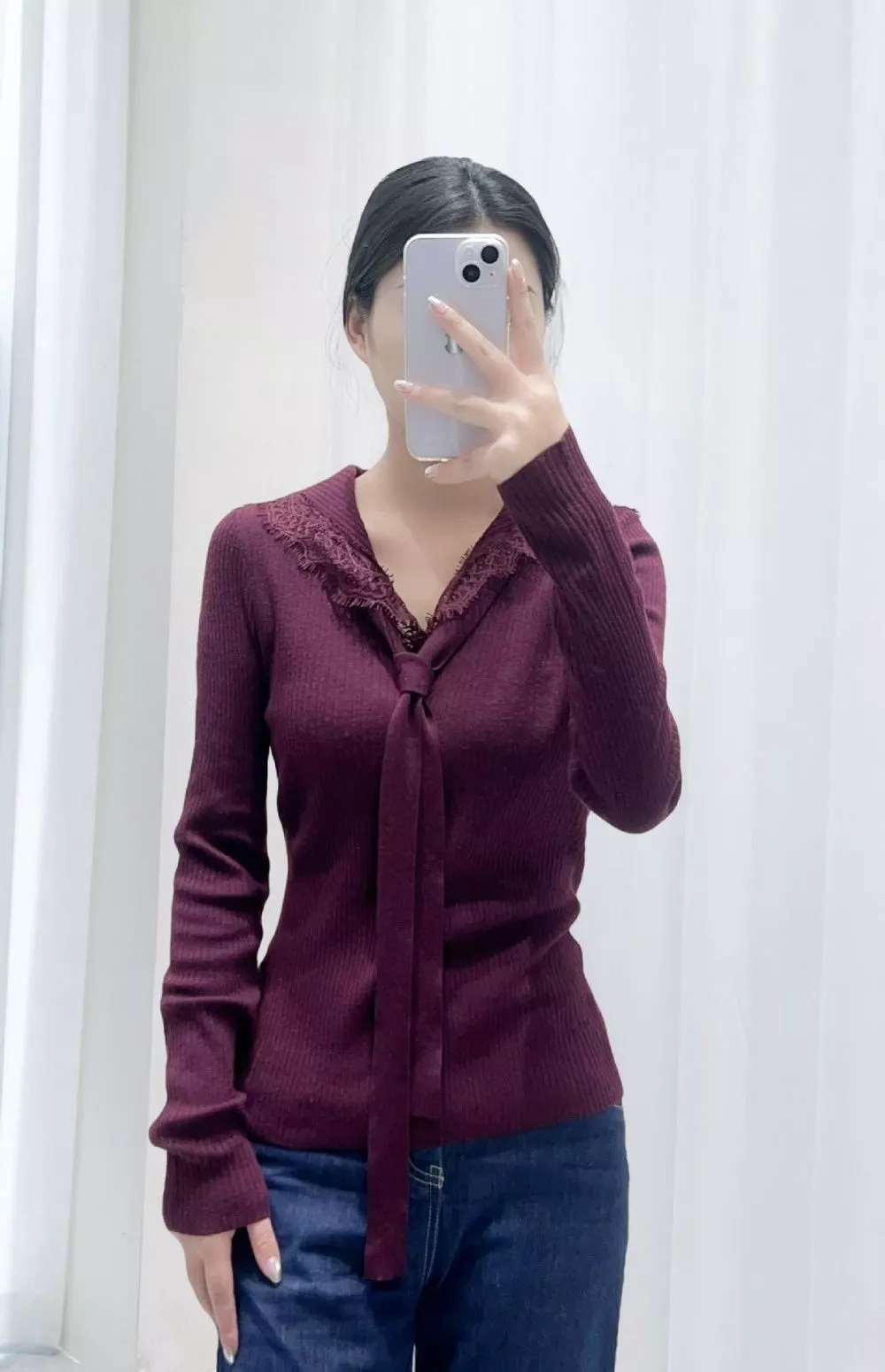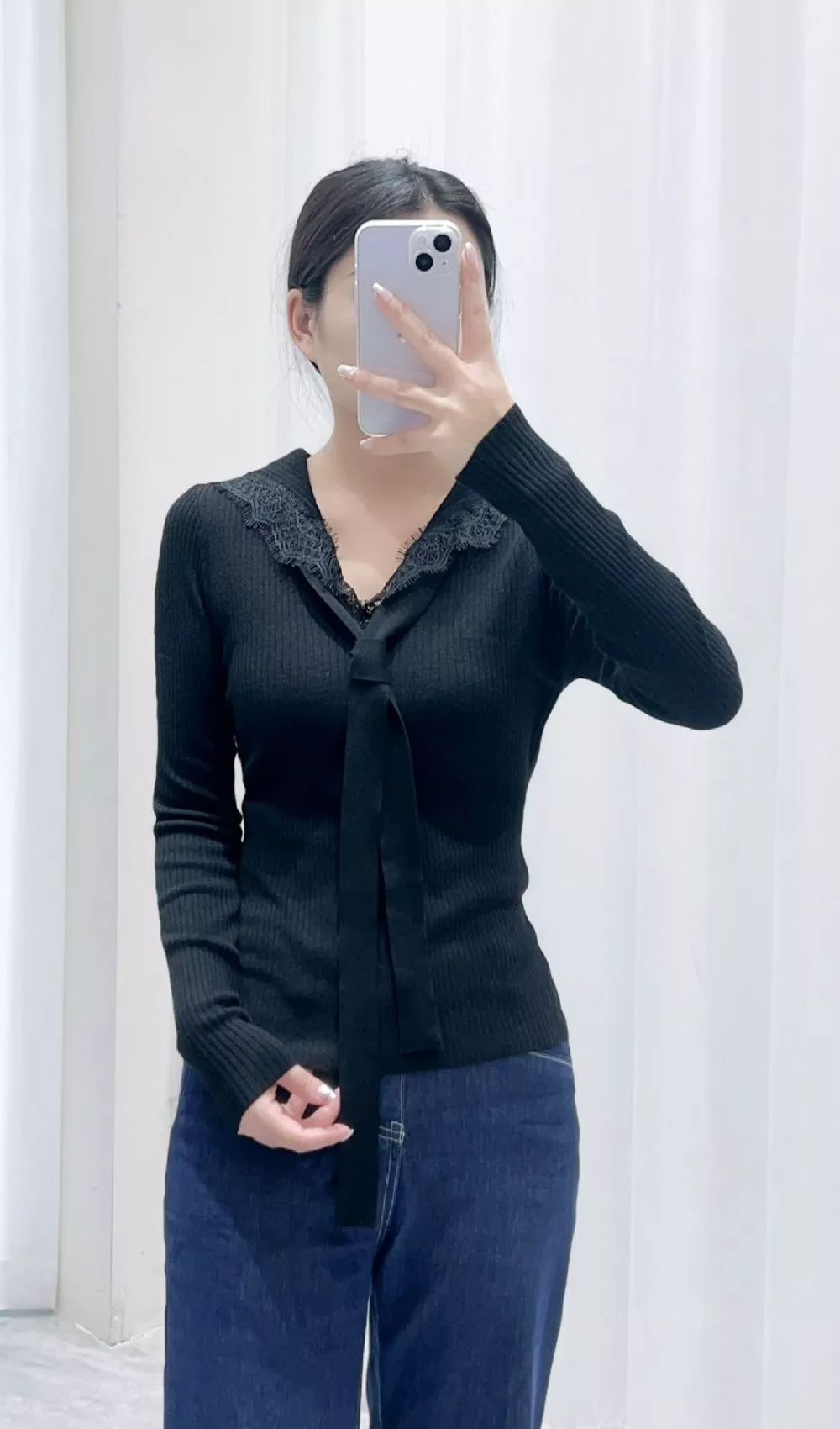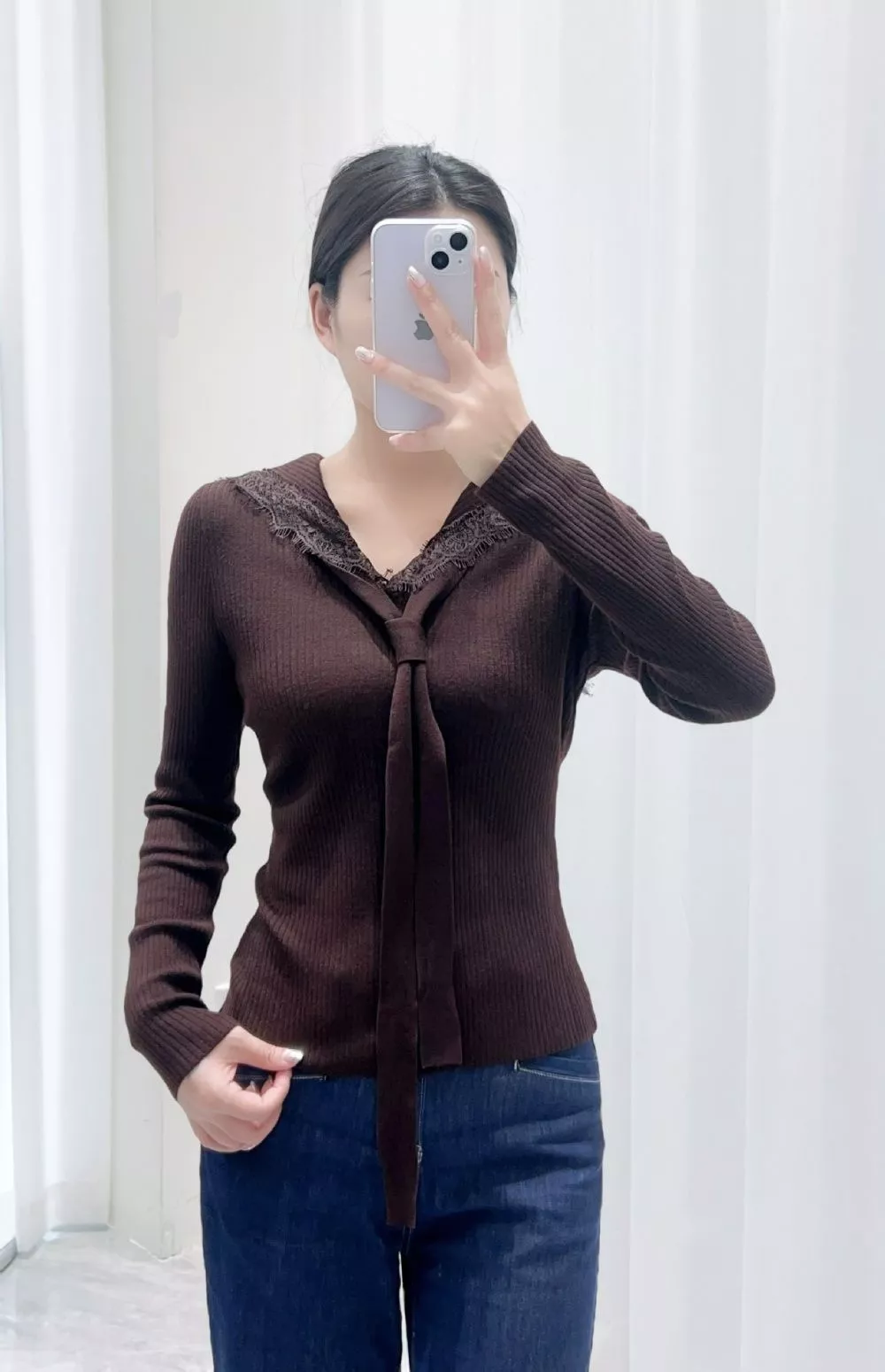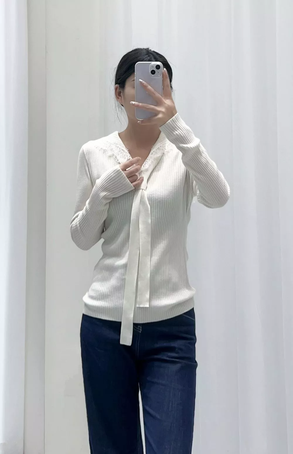 ùùùùMaglia da donna a costine sottili con vestibilità aderente, pensata per valorizzare la silhouette in modo naturale. Il design è caratterizzato da uno scollo a V rifinito con inserto decorativo in pizzo e da un cravattino centrale in tessuto coordinato che aggiunge un dettaglio femminile e raffinato.