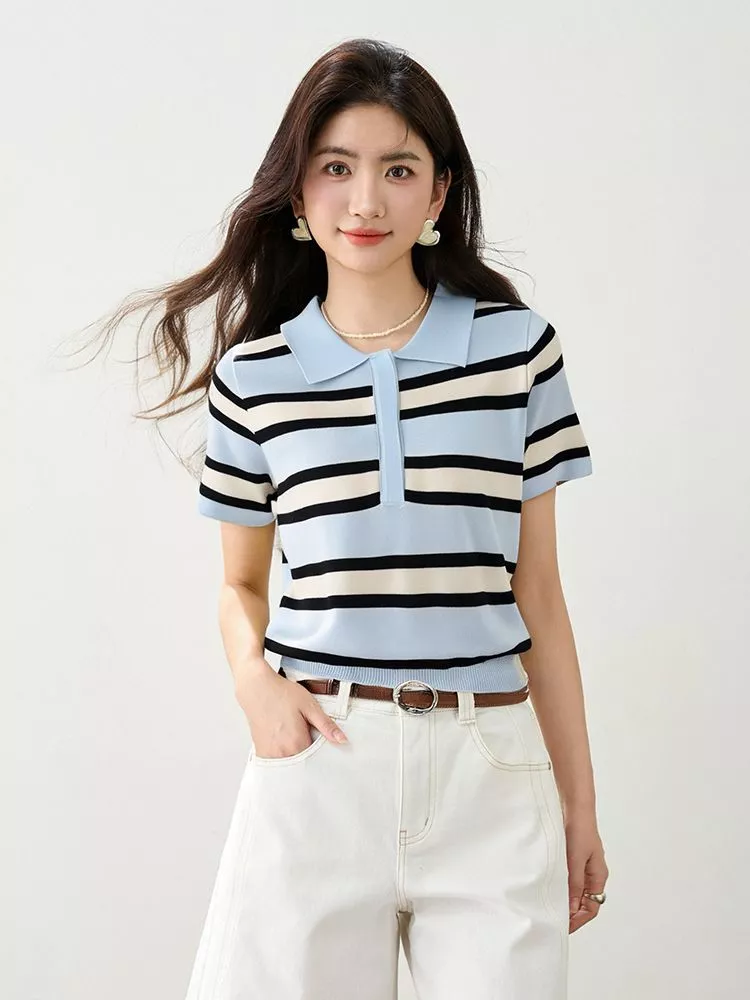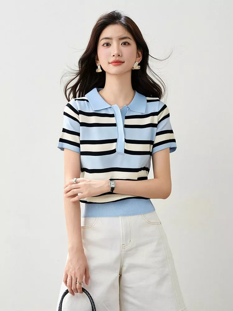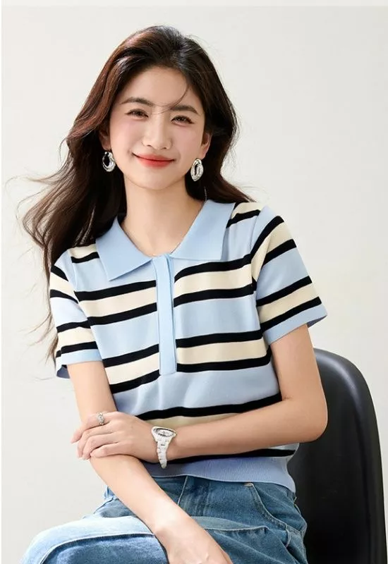 Maglia A Righe Blu Con Colletto Classico E Bottoni In Stile Retrò CF47503