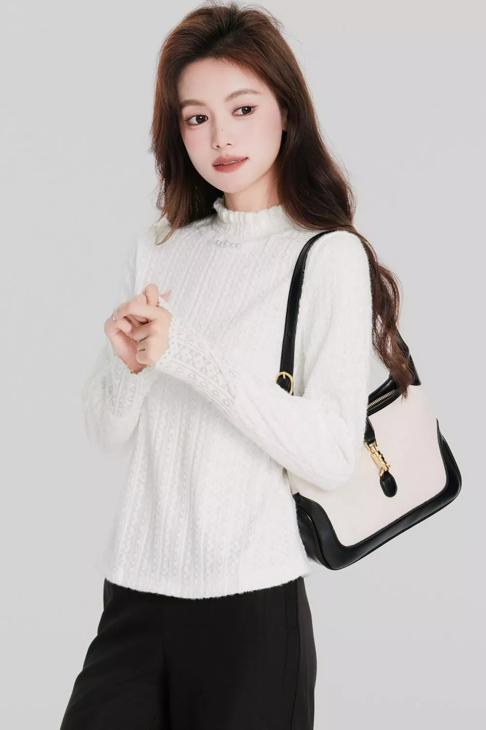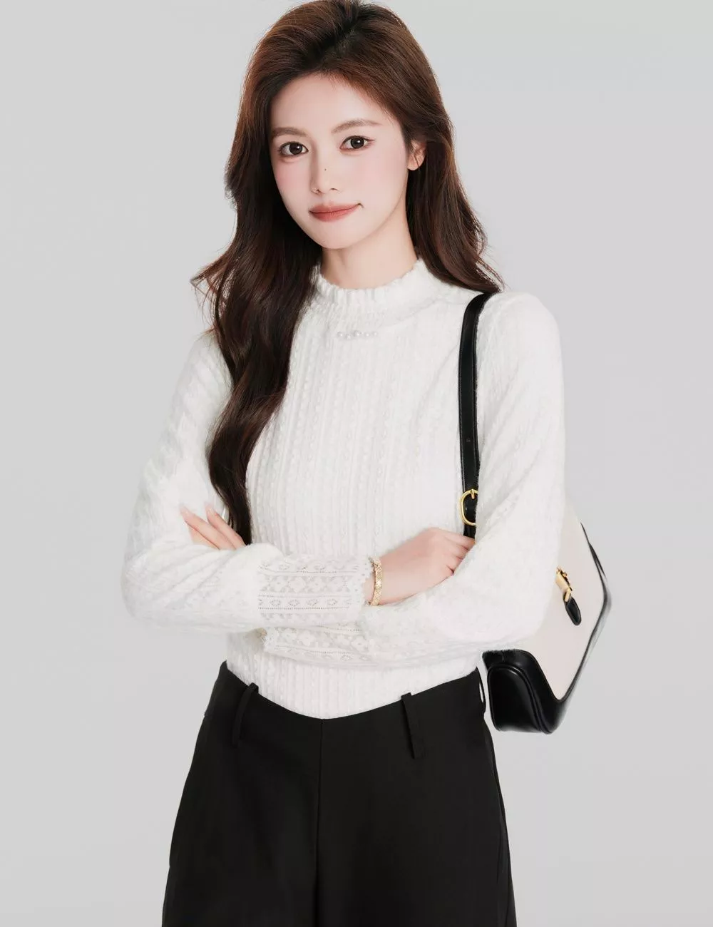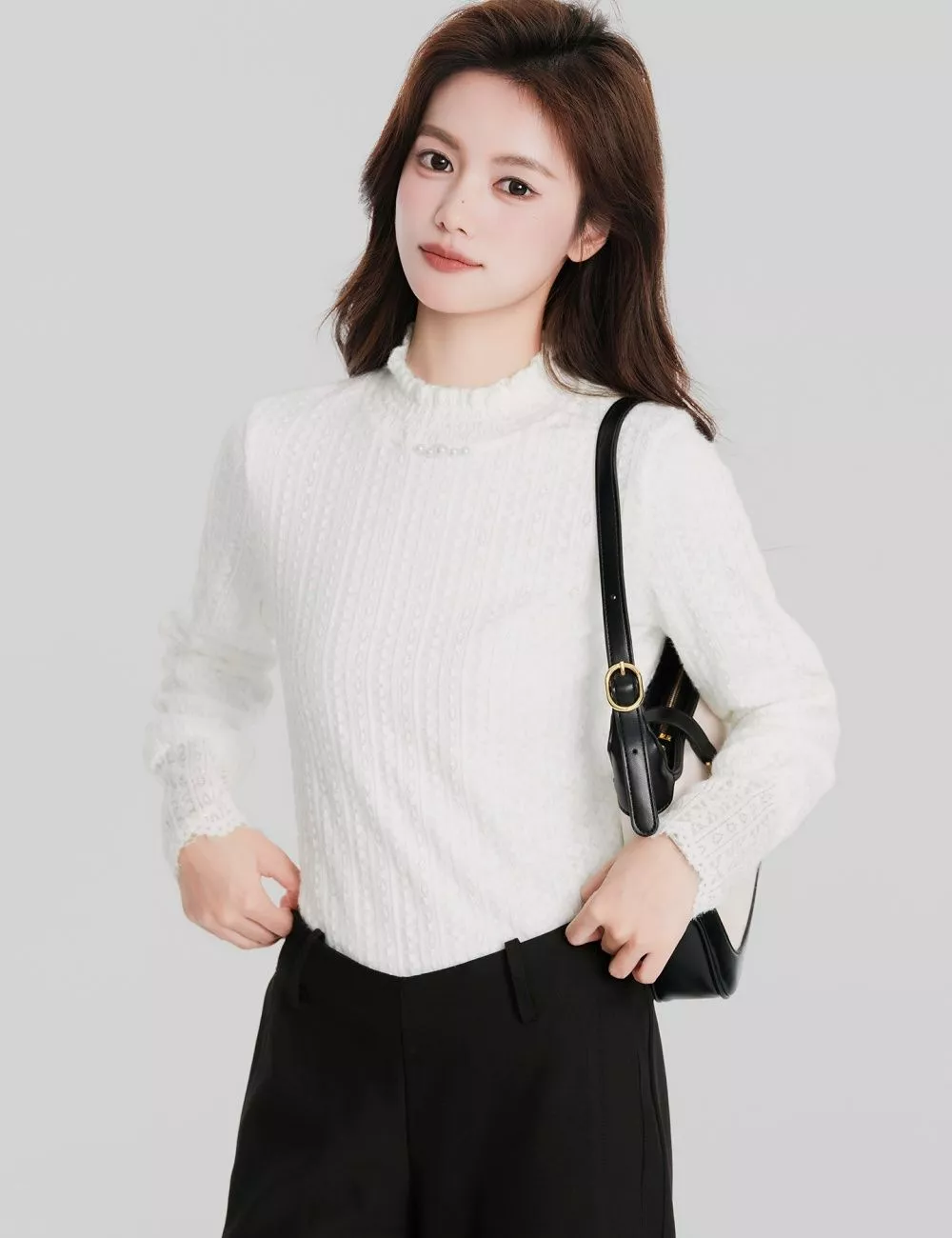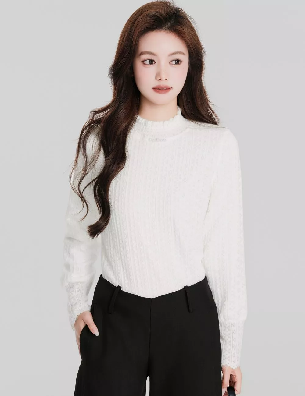 Maglia bianca elegante con ricami in pizzo, ideale per creare look chic e femminili. Il tessuto è morbido e confortevole, con una trama sottile che valorizza la silhouette senza risultare aderente. Il collo leggermente arricciato e i dettagli in pizzo sulle maniche donano un tocco raffinato, perfetto sia per outfit quotidiani curati sia per occasioni più formali. Un capo versatile, facile da abbinare a pantaloni classici o gonne per uno stile pulito e luminoso.