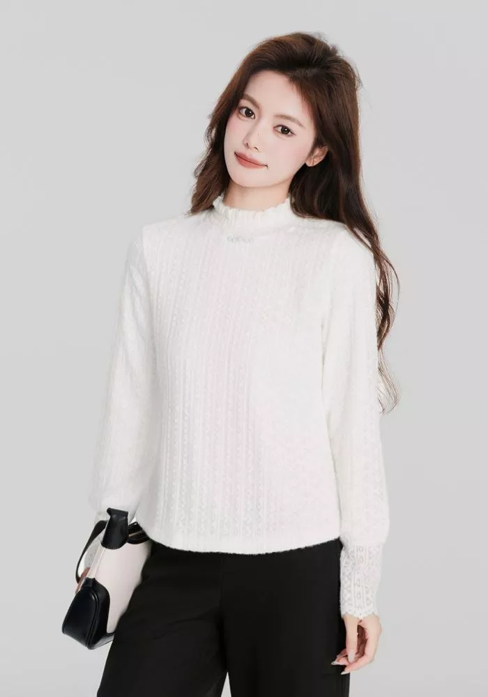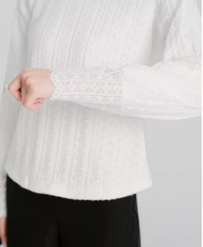 Maglia Bianca Elegante Pizzo Maniche Lunghe Tessuto Morbido Chic Donna CF58831