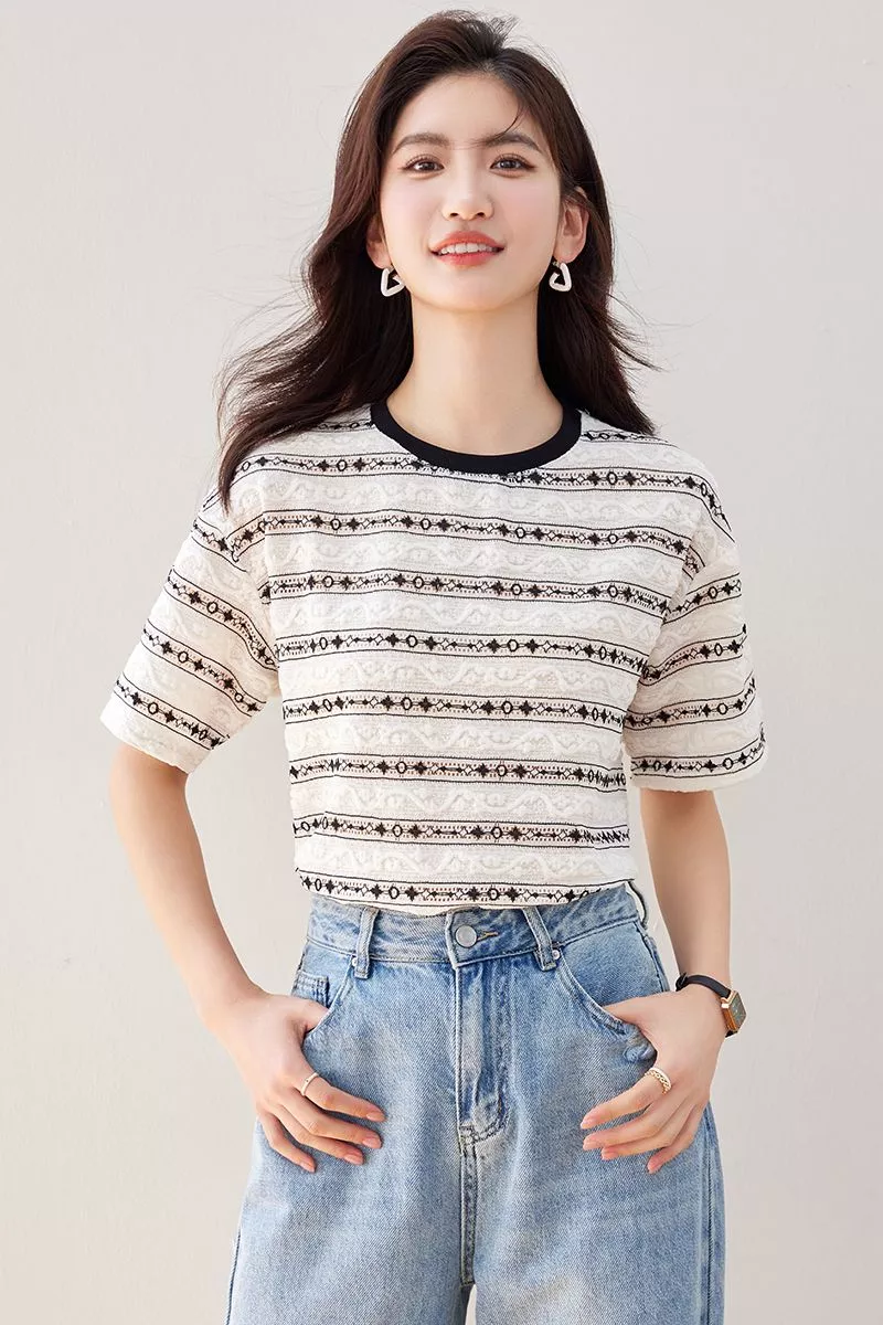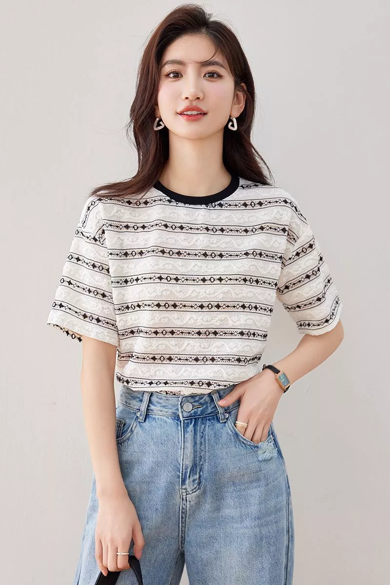 Maglia Donna Beige Fantasia Tribale Girocollo Casual Manica Corta CF69090