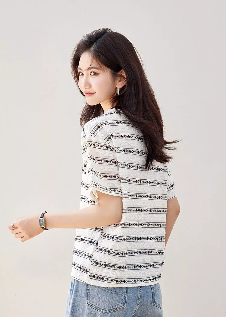 Il girocollo classico e le maniche corte rendono questa maglia facile da indossare e da abbinare con jeans, pantaloni o gonne. Il taglio morbido assicura comfort e libertà di movimento mantenendo una linea femminile e naturale.