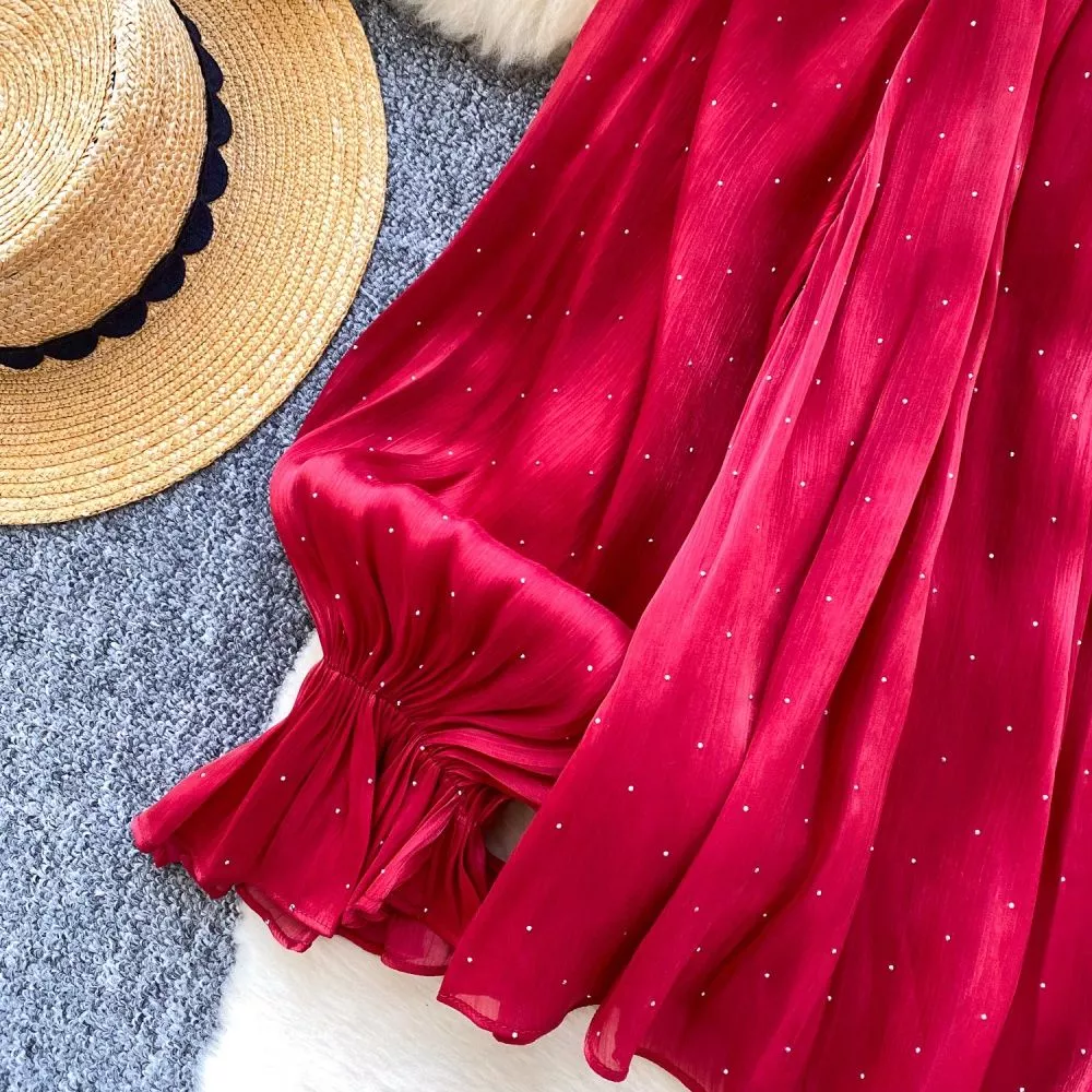 Maglia Donna Fluida Garza Plissettata Elegante Con Maniche Ampie Rosso CF65395