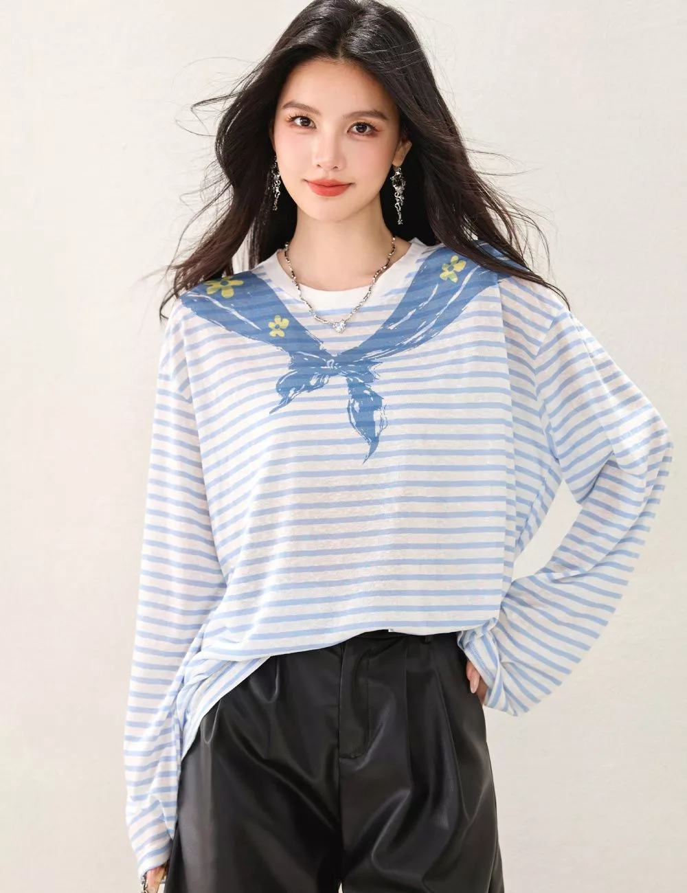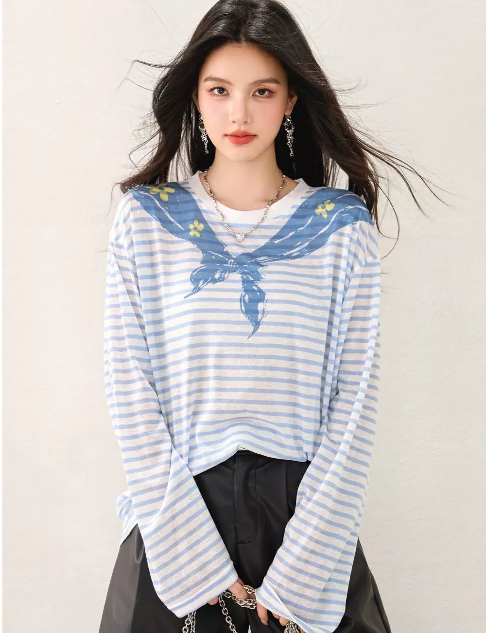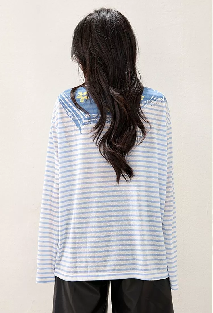 Maglia casual dal design fresco e moderno con stampa a righe ispirata allo stile marinaio. Il taglio morbido e confortevole la rende perfetta per outfit quotidiani e look rilassati.