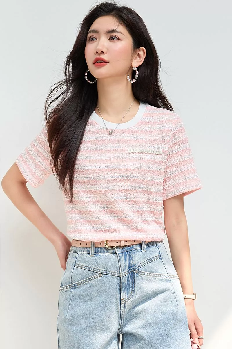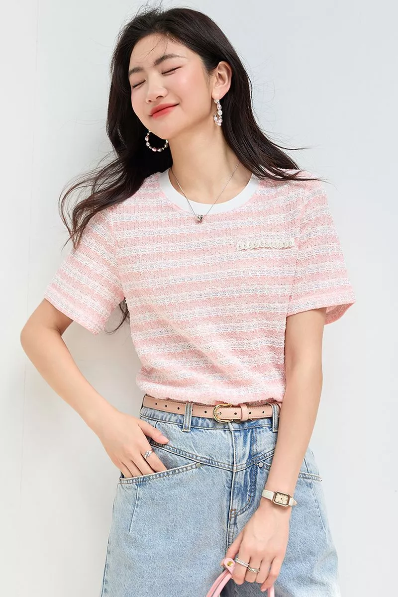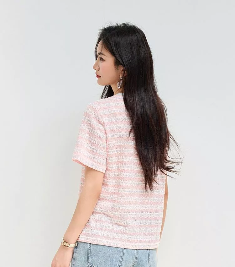 Maglia Donna Rosa Bouclé Girocollo Elegante Casual Chic Manica Corta CF69099