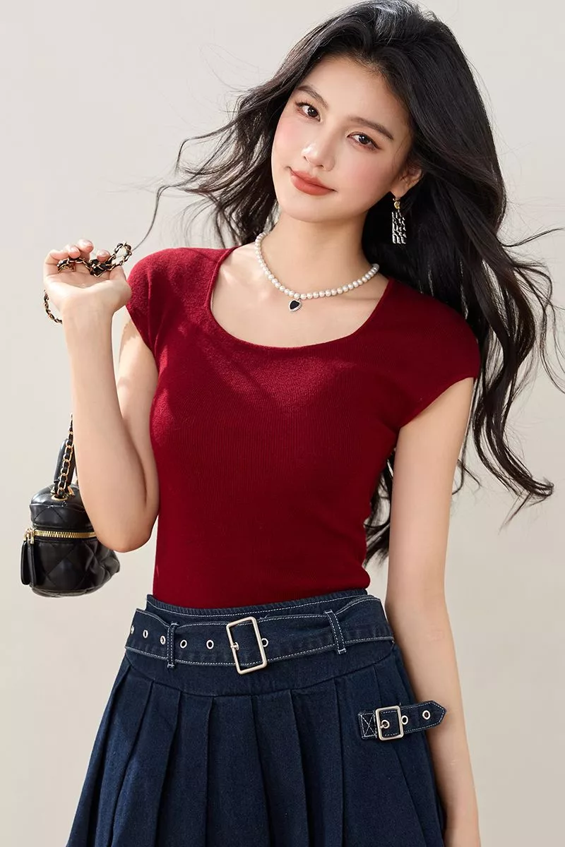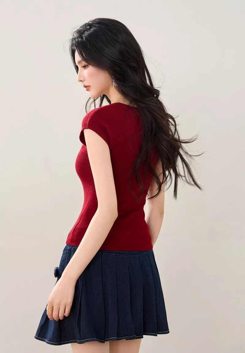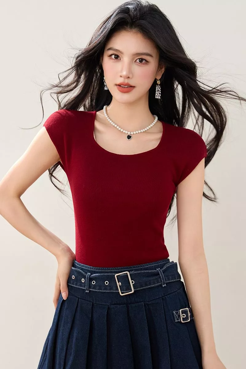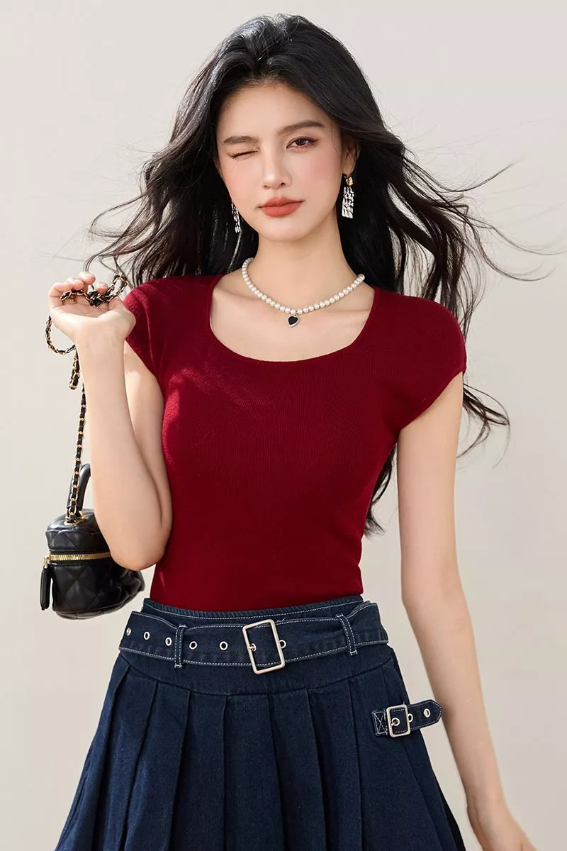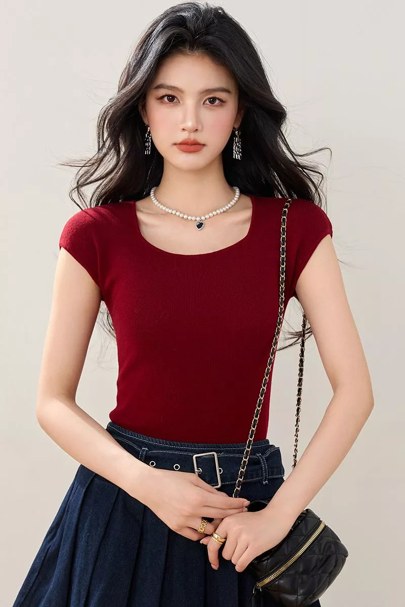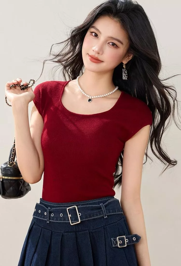 Maglia estiva da donna in tonalità rossa, dal taglio slim e realizzata in maglia sottile e traspirante 🔥. Il design minimal con scollo a U e maniche corte valorizza la figura senza rinunciare alla comodità. Perfetta da indossare da sola o sotto giacche leggere per look estivi semplici ma curati.