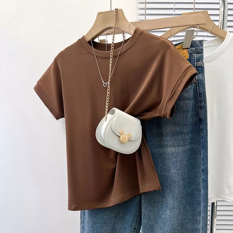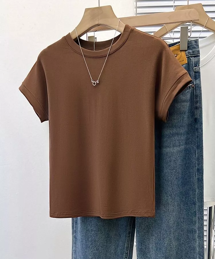 Maglia Maglietta Donna T-shirt Blusa Top Marrone Raso Cotone CF12813