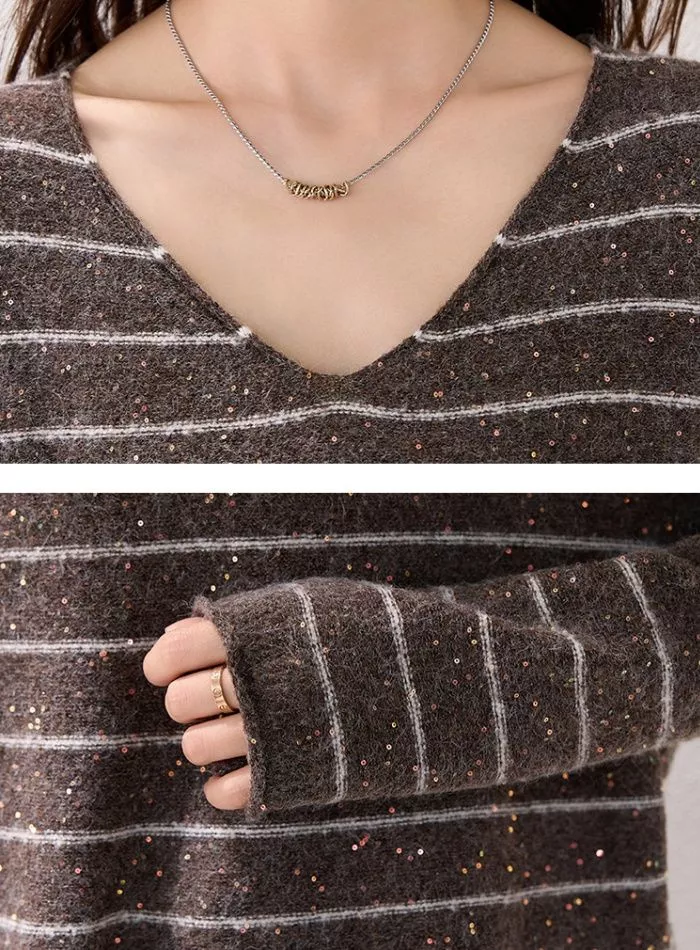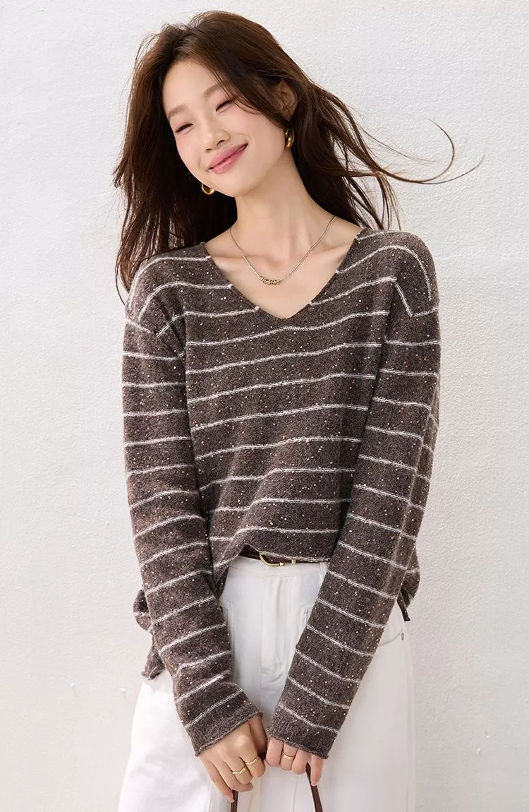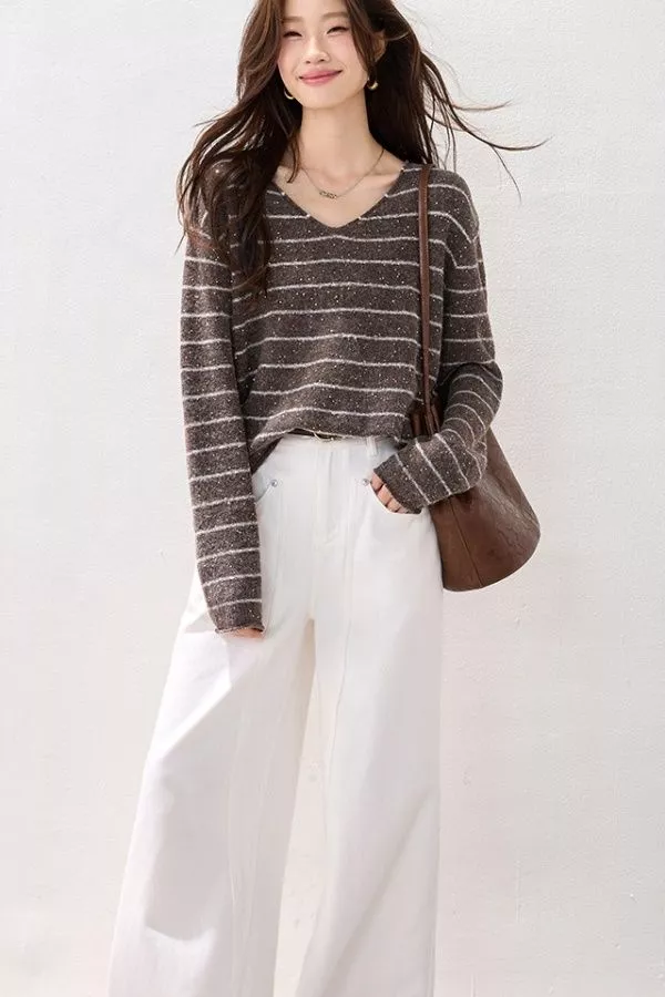 Questa maglia marrone a righe unisce comfort e stile in un modello versatile perfetto per la stagione fredda. La lavorazione morbida e le leggere sfumature luminose donano un aspetto curato senza rinunciare alla comodità, mentre lo scollo a V slancia la linea e valorizza qualsiasi outfit quotidiano. Ideale da abbinare a jeans, pantaloni chiari o gonne morbide, aggiunge un tocco caldo e moderno al guardaroba, rendendola una scelta facile e sempre adatta alle occasioni informali.