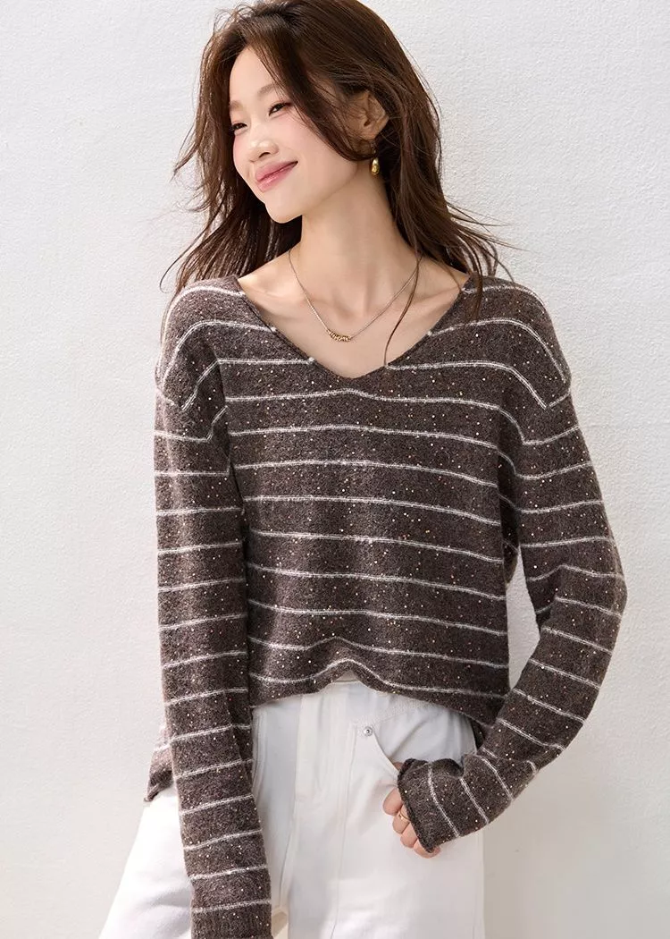 Maglia Marrone Righe Scollo A V Caldo Casual Elegante Donna Morbida CF60075