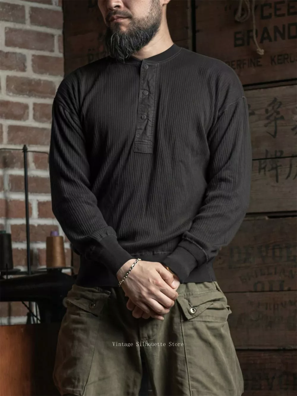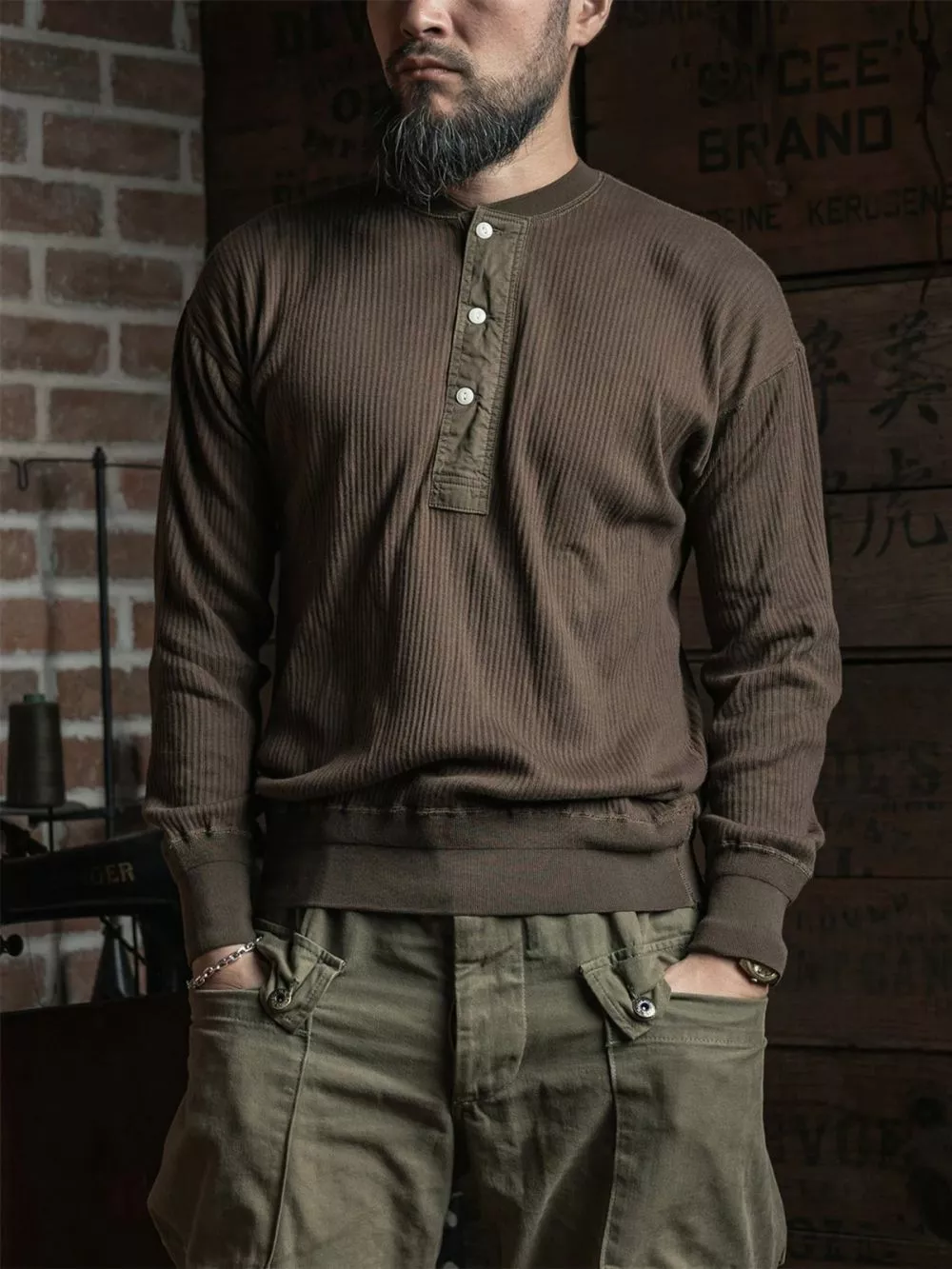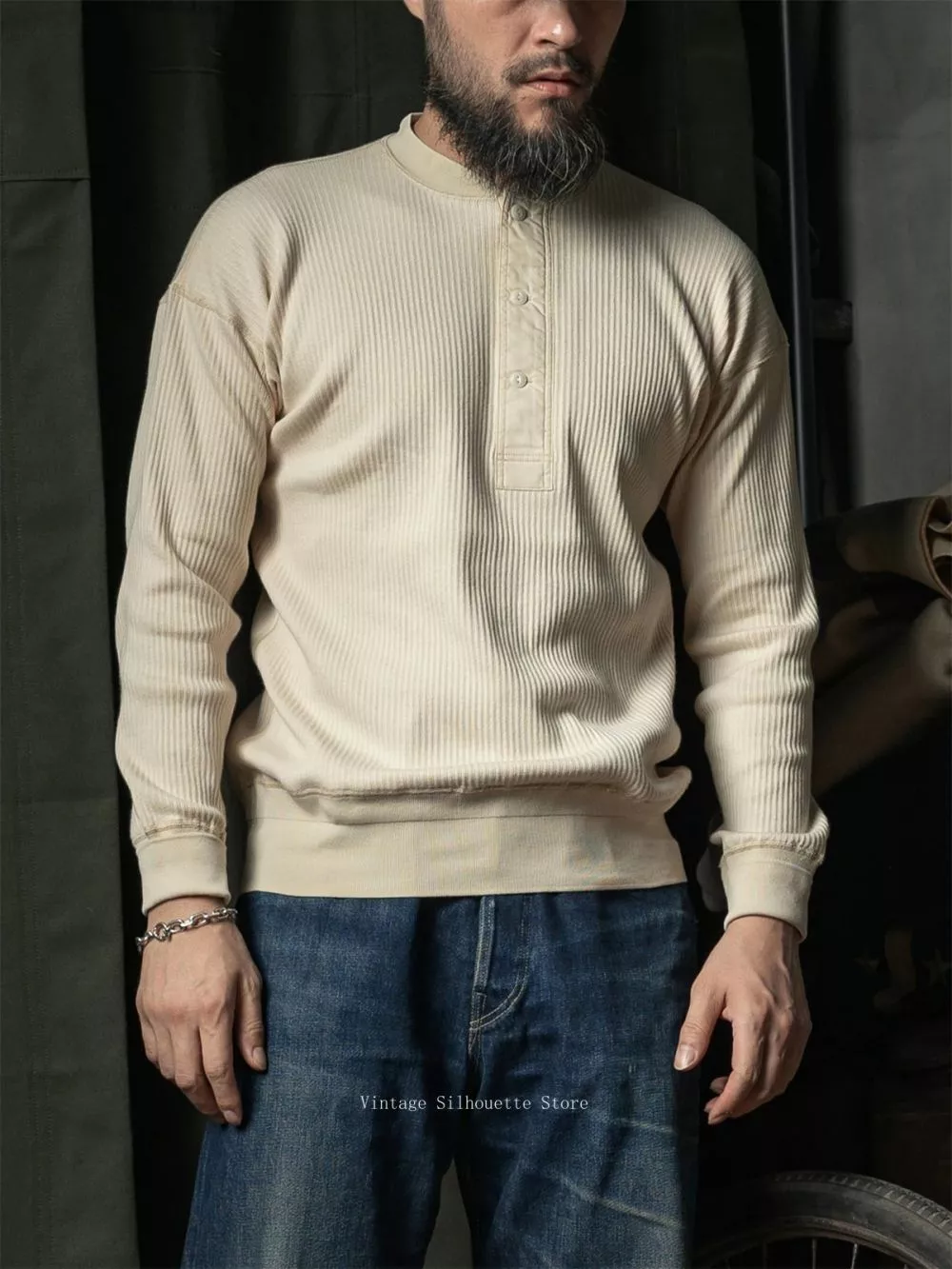 Maglia Uomo Henley A Coste Beige Vintage Casual Manica Lunga Cotone H1366