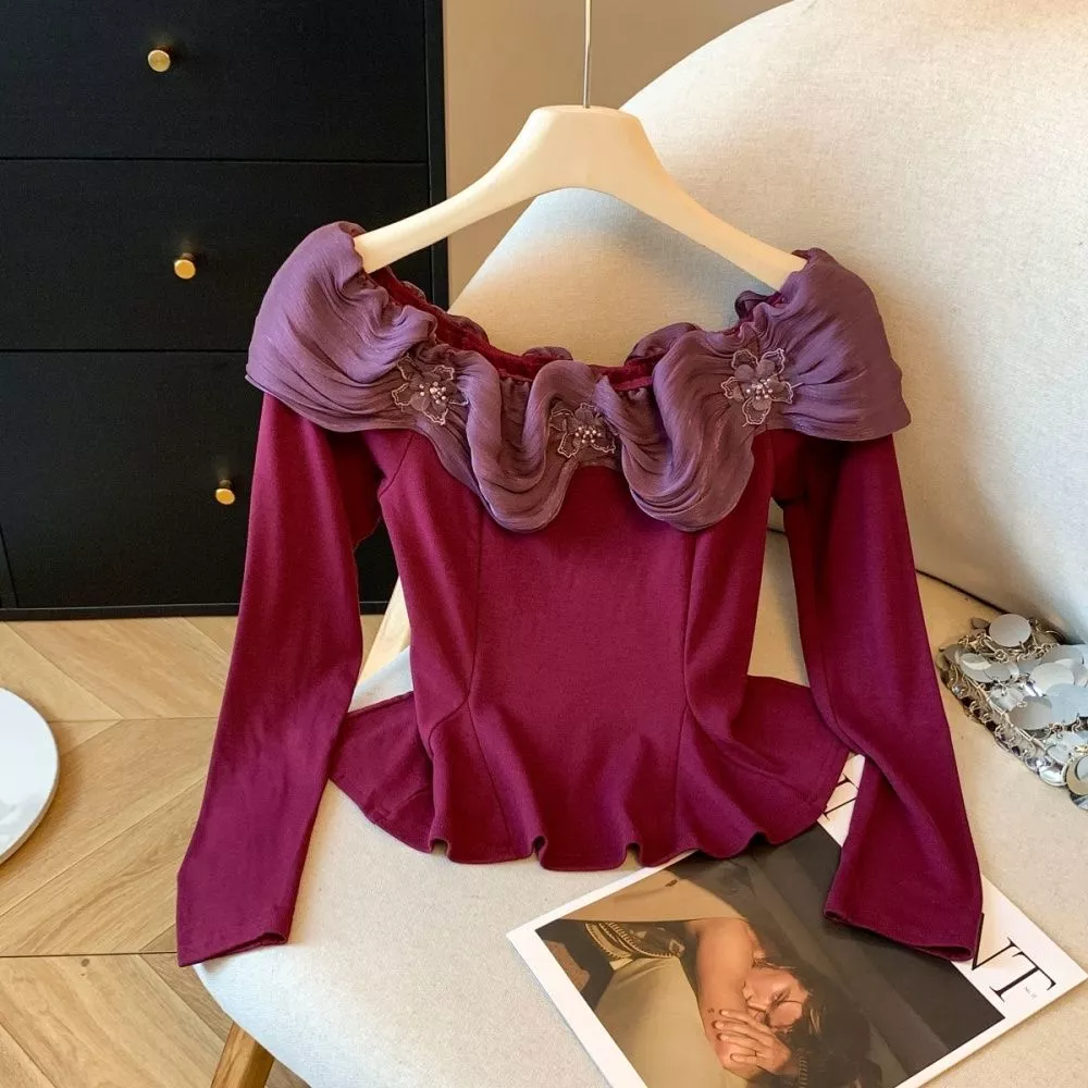 Maglietta Donna Elegante Con Collo Bardot E Volant Decorativi Viola CF65644