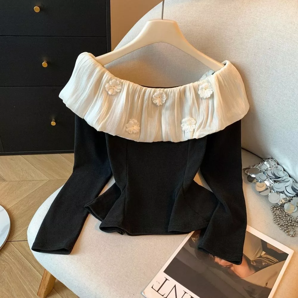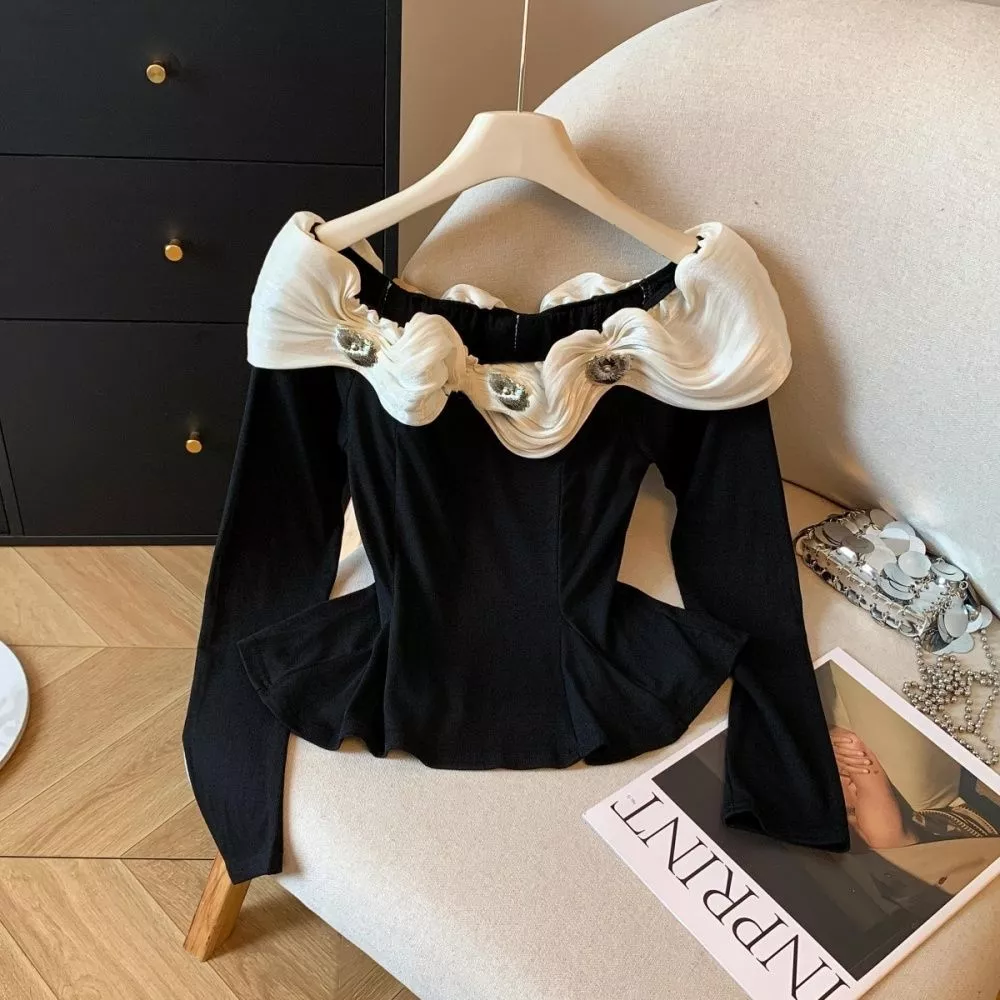 Maglietta Donna Elegante Con Collo Bardot E Volant Decorativi Nero CF65646