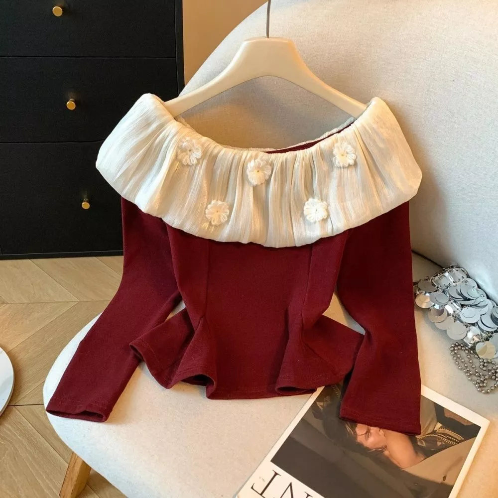 Maglietta Donna Elegante Con Collo Bardot E Volant Decorativi Rosso Vino CF65649