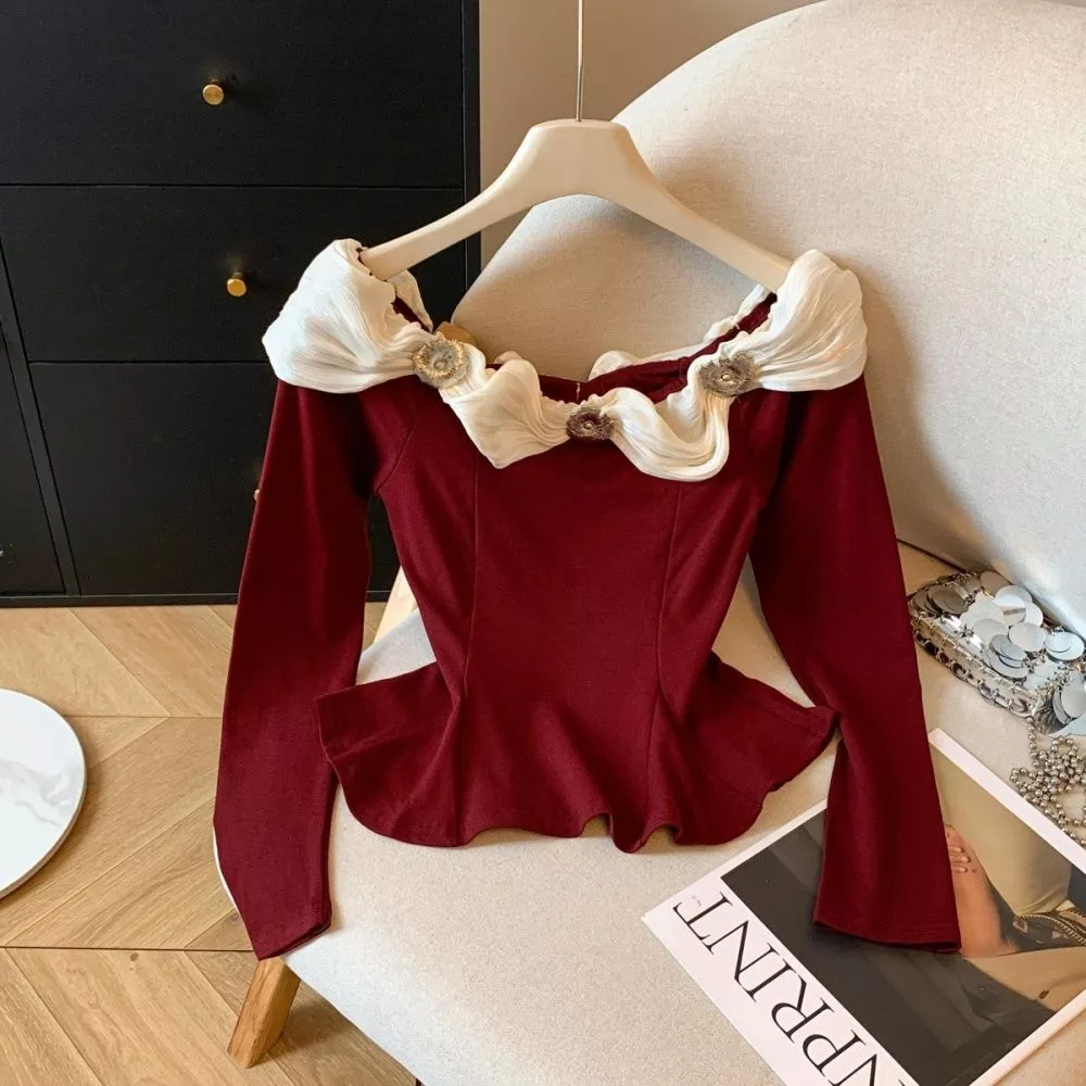 Maglietta Donna Elegante Con Collo Bardot E Volant Decorativi Rosso Vino CF65646
