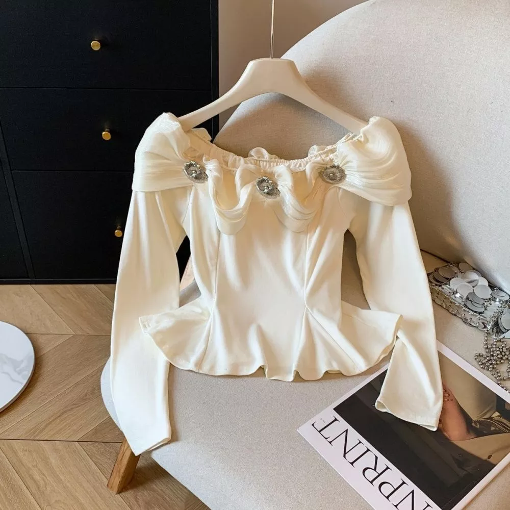 Maglietta Donna Elegante Con Collo Bardot E Volant Decorativi Albicocca CF65644