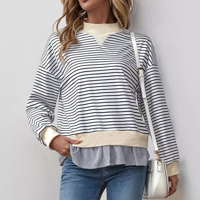 Felpa Donna Bianco Con Righe Nere E Fondo A Contrasto Stile Casual CF52291