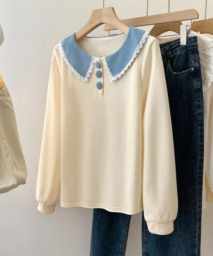Blusa Chiara Con Colletto A Coste Azzurro Bottoni Decorativi Elegante CF53558