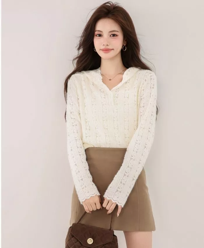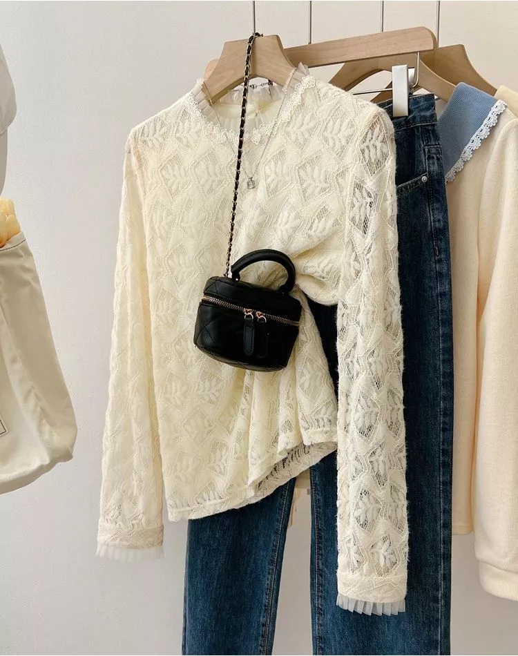 Maglia In Pizzo Albicocca Con Collo Rifinito Romantica A Maniche Lunghe CF53563