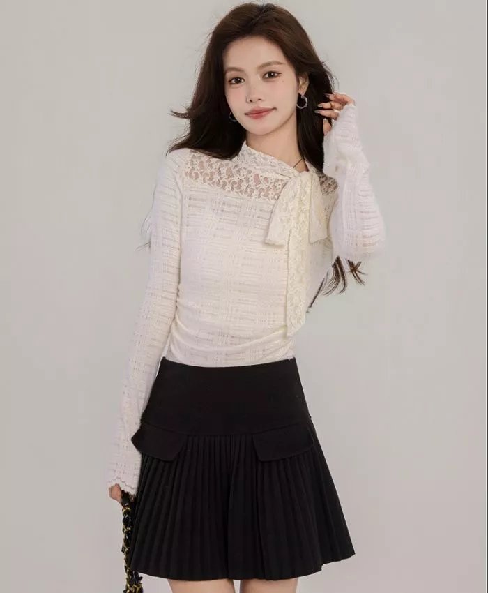 Blusa Elegante Albicocca In Pizzo Con Fiocco Al Collo E Maniche Lunghe CF53801